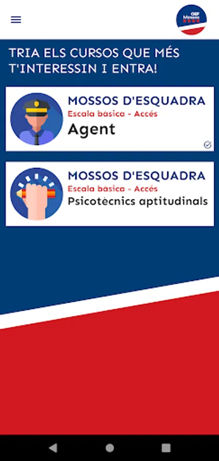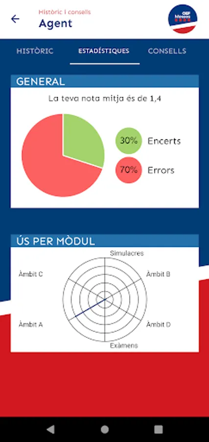 At OEF MOSSOS you will find useful, up-to-date and quality teaching materials that will help you in your preparation for the Mossos d'Esquadra exams. Specifically, we put at your disposal more than 5,000 tests, the official syllabus of all subjects so that you can refer to it if you have doubts while taking the tests, podcasts of all subjects, mock exams, exam models from recent years, and personalized study tips based on your test-taking performance.
