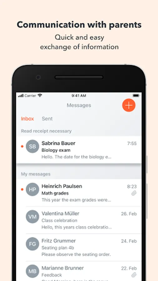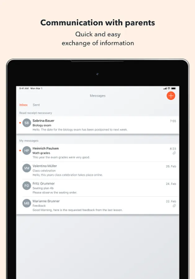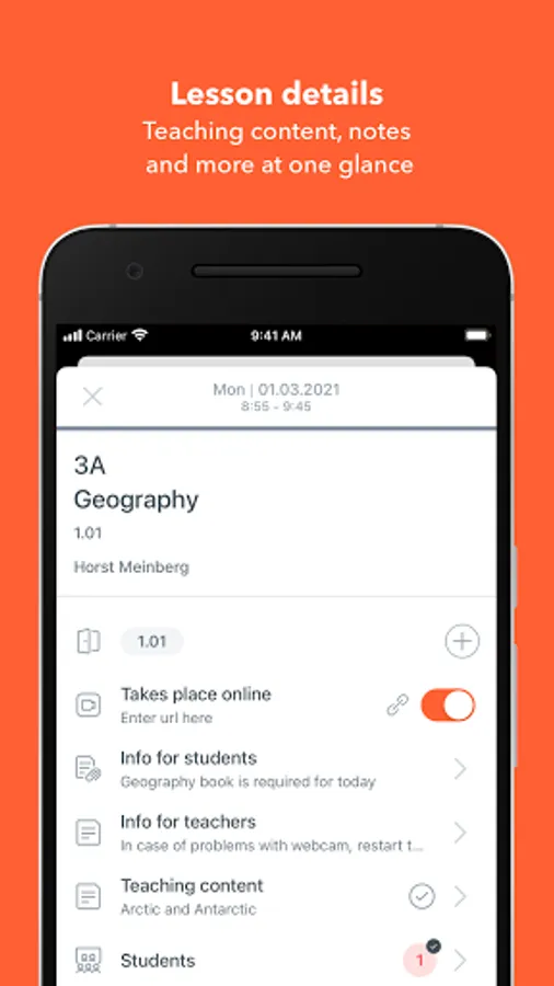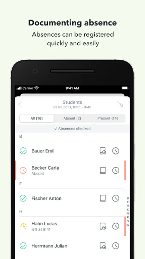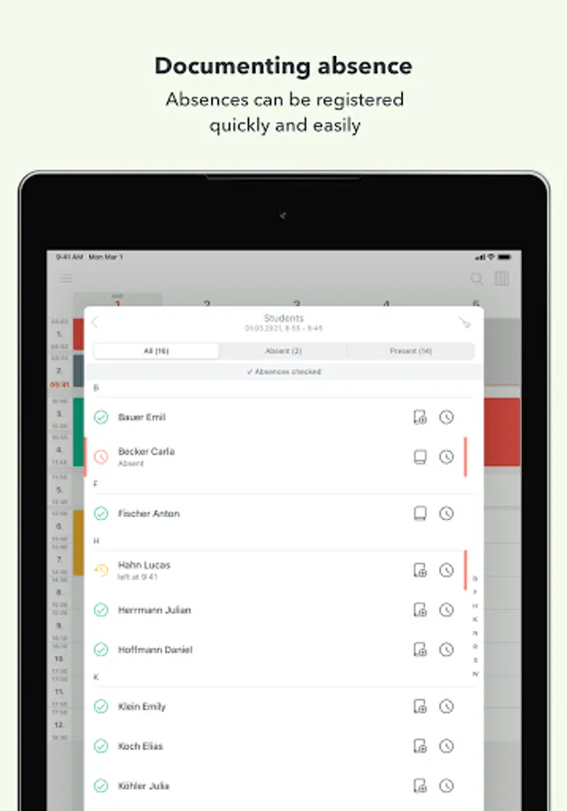 - Digital class register: Attendance check, class register entries, sick note by students or parents