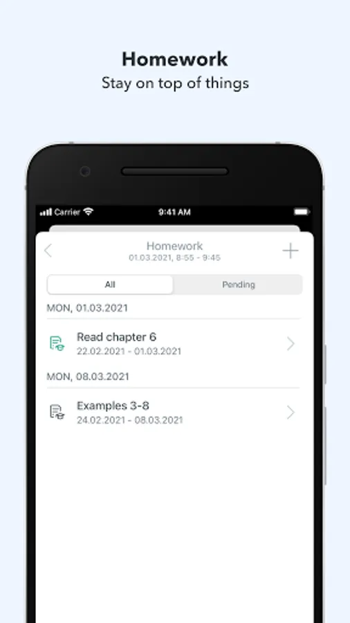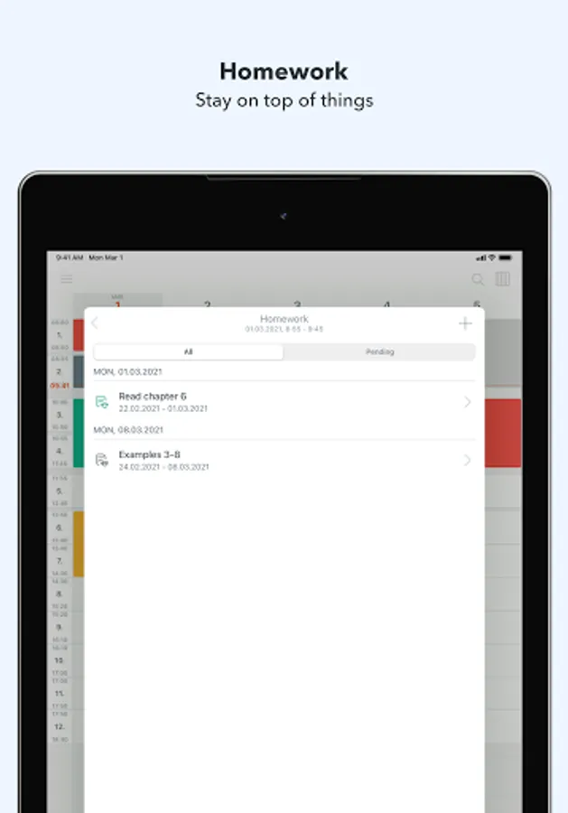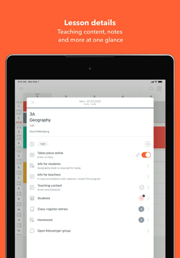 - Exam dates, homework and video links to online lessons directly in the timetable