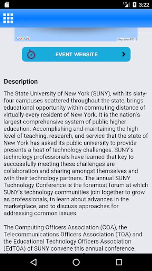 The SUNY Events mobile app allows attendees of various SUNY Events to access agendas, see session descriptions, speaker information and additional information about the event.
