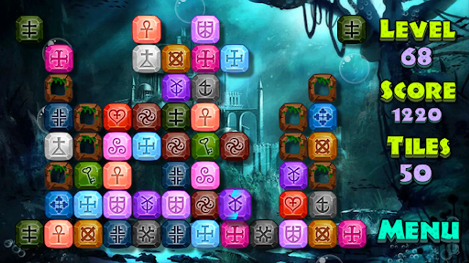 Your goal is remove all matching tiles from the board in Atlantis. You need to match two tiles by connecting them with a pathway, but only two matching runes can be removed at a time.
