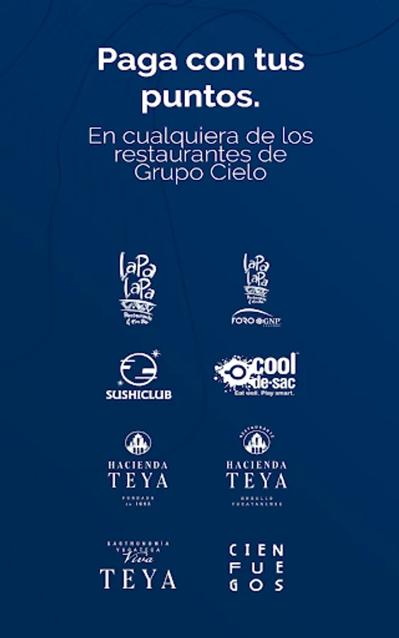 Cielo Rewards is the first reward program of Grupo Cielo, where with each purchase you accumulate points, which you can use in any of our establishments. One point equals one weight. Download the app to know all its benefits, redeem prizes, check your points balance and pay with them at any of the restaurants of Grupo Cielo: Lapa Lapa, SushiClub, Cool de Sac, Hacienda Teya, Teya Viva, Cienfuegos.