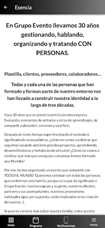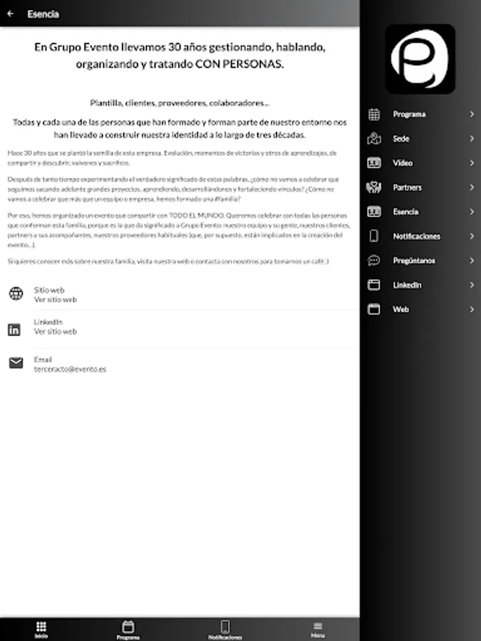 For this reason, we have organized an event to share with the WHOLE WORLD. We want to celebrate with all the people that make up this family, because it is what gives meaning to Grupo Evento: our team and its people, our clients, partners and their companions, our usual suppliers (who, of course, are involved in the creation of the event…).
