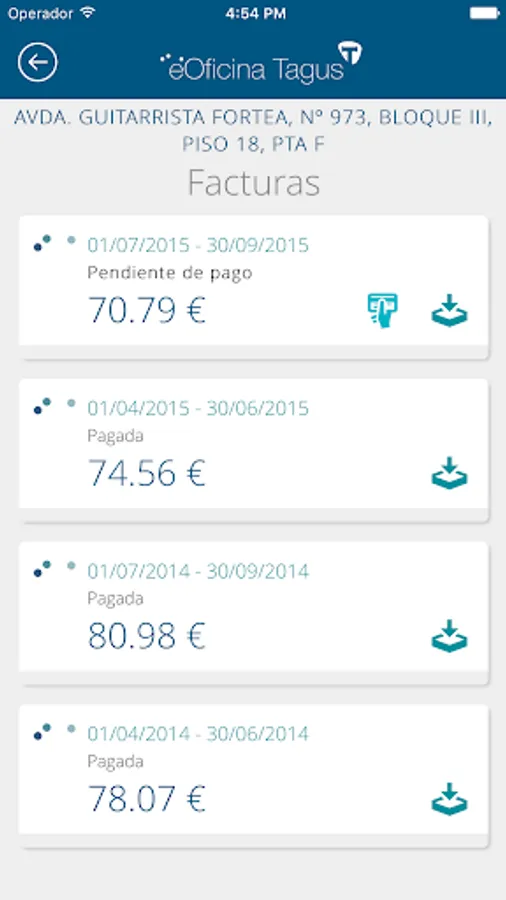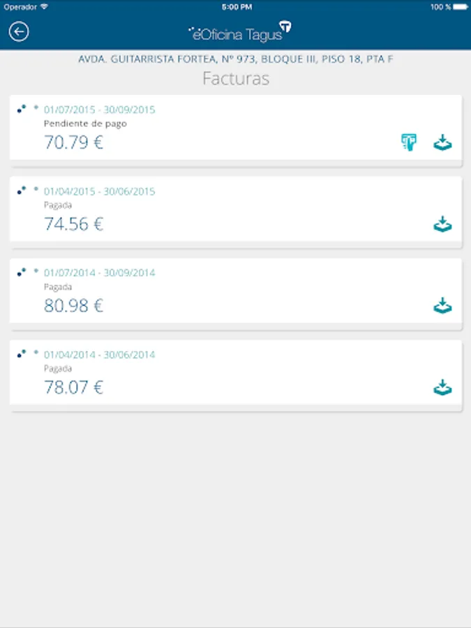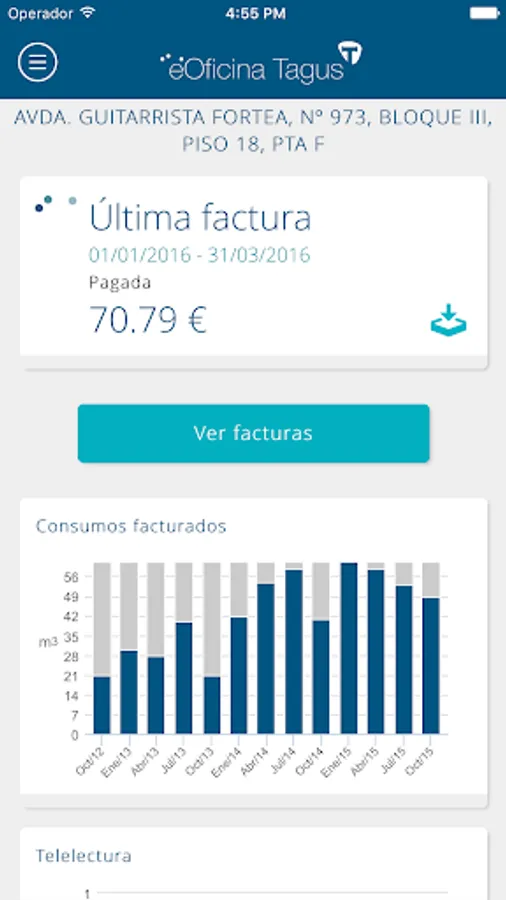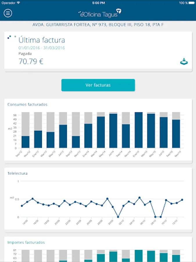 The app of the Tagus eOficina allows you to perform the most common steps for any user. With this application you can check your contracts and invoiced consumption as well as download and pay your bills and modify contact details and direct debit. You can also send us your meter reading and let us know if it detects a fault in the street.