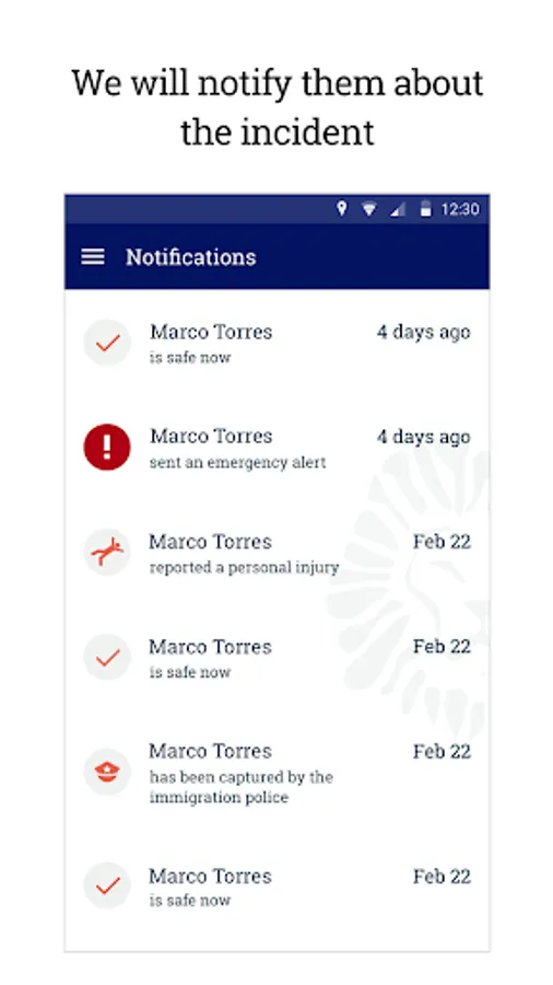 Report any kind of accident and we will provide with immediate legal and medical assistance in real time. We will notify your emergency contacts of any work, personal injury o car accident reports and as a bonus you get to alert them for immigration capture incidents as well.