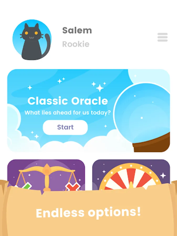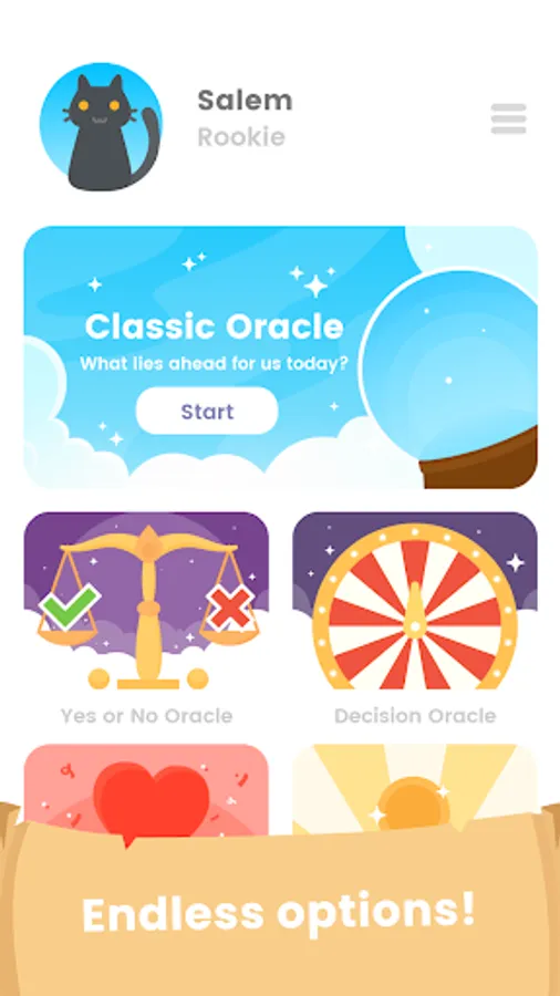 1. 🔮 Classic Oracle - For lovers of the classic oracle. Touch the Magic Crystal Ball and discover your general prediction for today.
