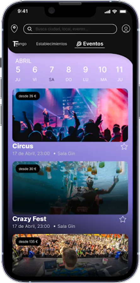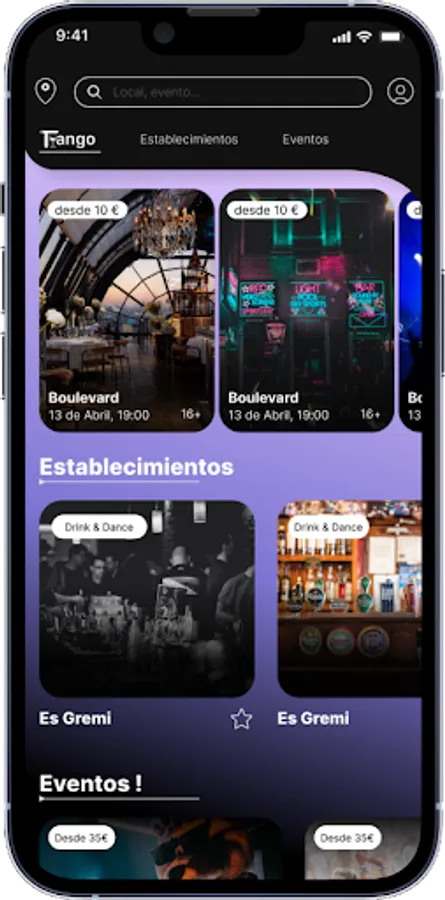 Discover all the events in your city and get your ticket. Browse TangoApp and discover new events, new establishments, unbeatable offers and purchase tickets for them easily and safely. Find out what happens in the party world on the day you choose.