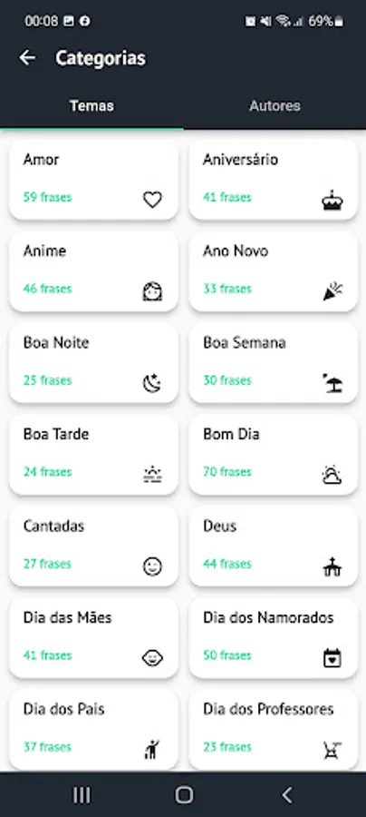 There are several options for phrases, such as: love, anime, movie, motivation, music, reflection, and many other subjects.