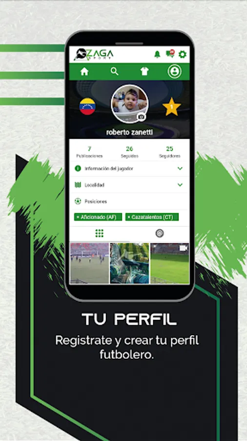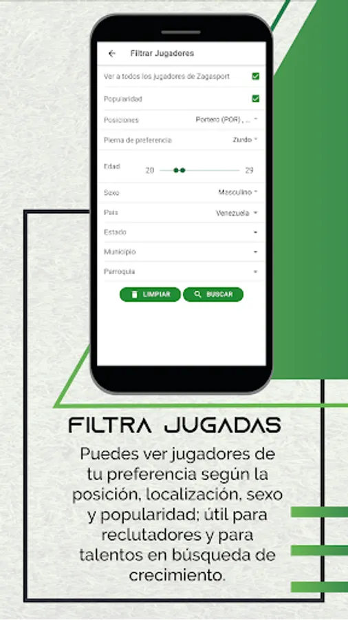• Through filters you can see players of your choice according to position, location, sex and popularity; useful for recruiters and talent seeking growth.