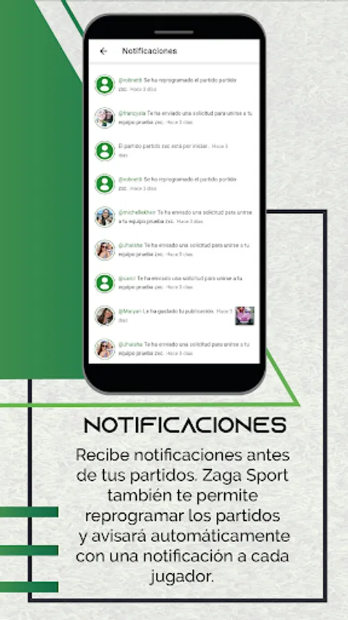 • Receive notifications before your matches. Zaga Sport also allows you to reschedule matches and will automatically notify each player with a notification.