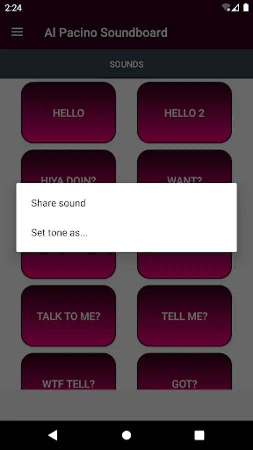 Al Pacino Soundboard contains various quotes of Al Pacino (Alfredo James Pacino). You can share your favorite Al Pacino sound with your friends. If you like the Al Pacino Soundboard, you can share this app.