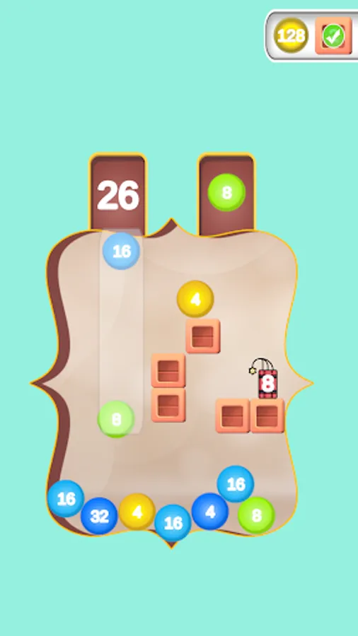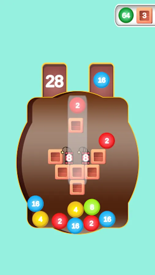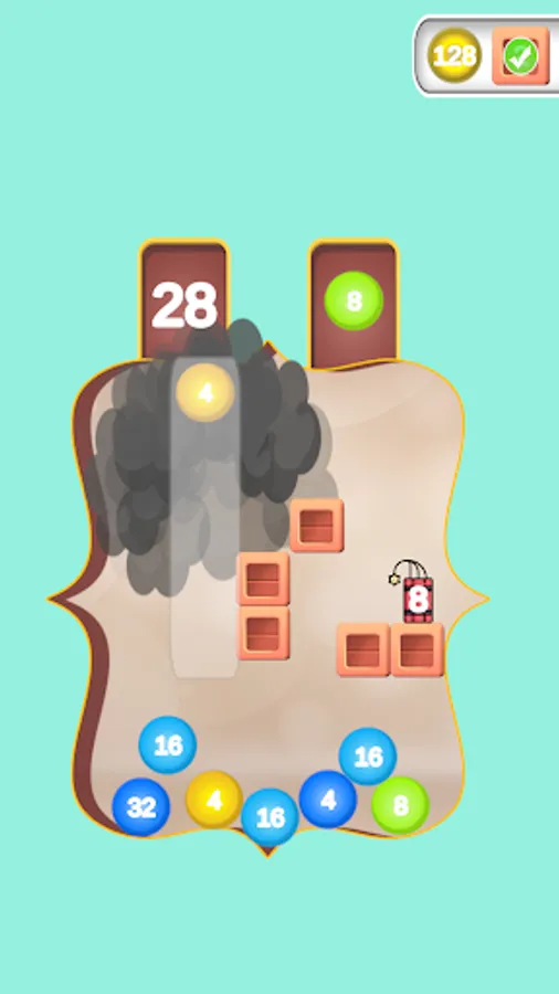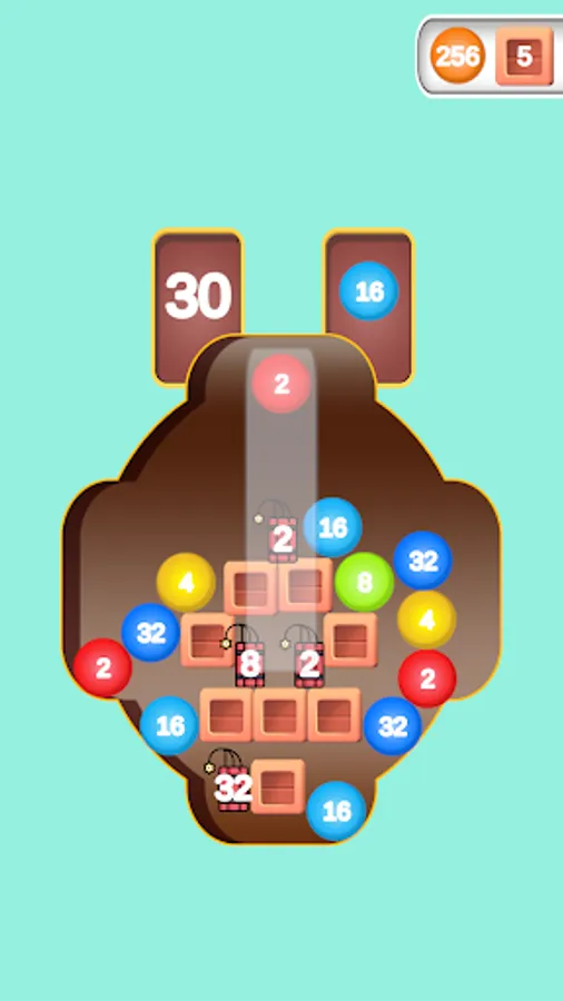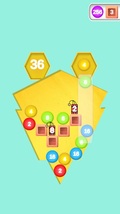 Numbered balls that are a multiple of two are randomly dropped. When the same balls hit each other, a larger number is formed. There are some obstacle blocks that prevent these balls from colliding with each other. There are bombs to blast these obstacles. When the number on the bombs hits the bomb, an animation occurs and the obstacles disappear. The level is completed successfully when the target size is reached and the obstacles are destroyed.