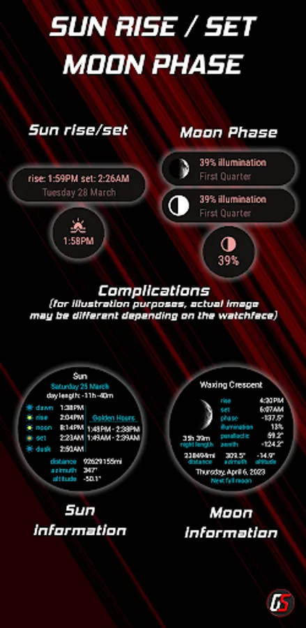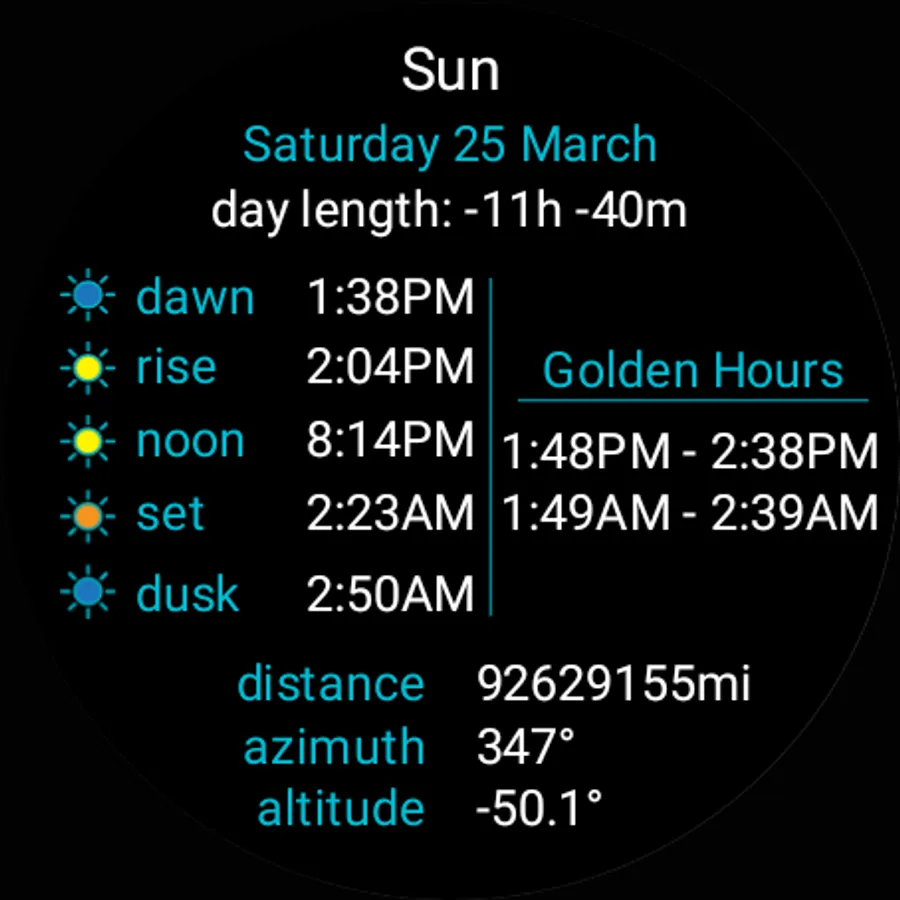 - Sun and moon details screens for the Sun Rise / Set and Moon Phase complications.