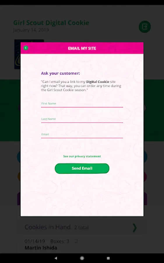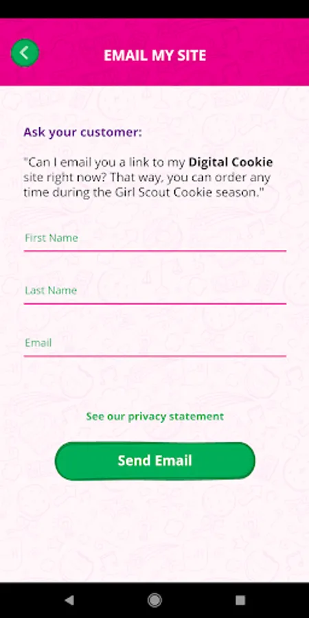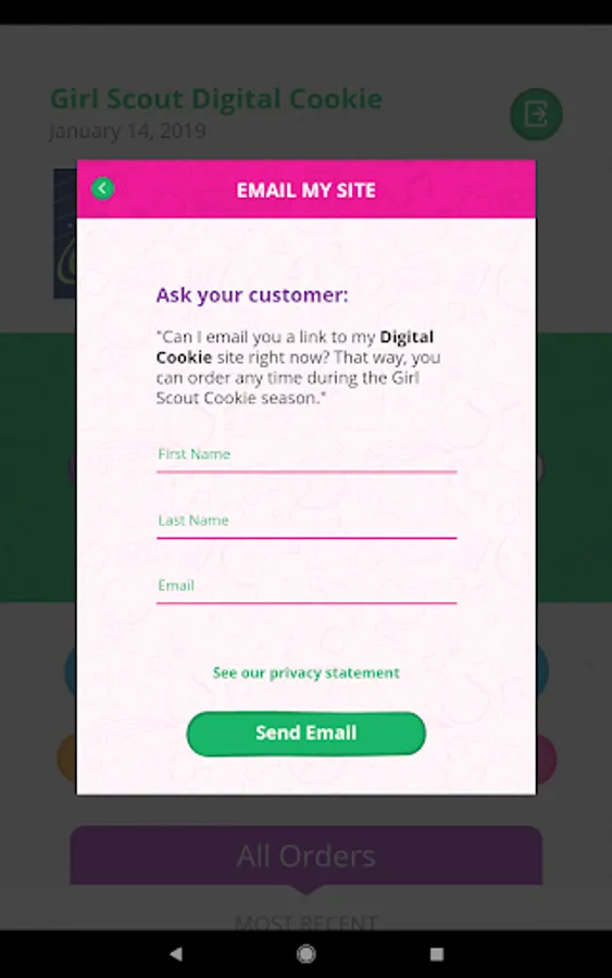 The app enables girls in the Girl Scout Cookie Program to bring their cookie business online as they take customer orders and grow their digital marketing skills. The mobile app is free to use and is designed for Little Brownie Baker Councils participating in Digital Cookie. You'll need a secure internet connection when using the app and data transfer charges might apply.