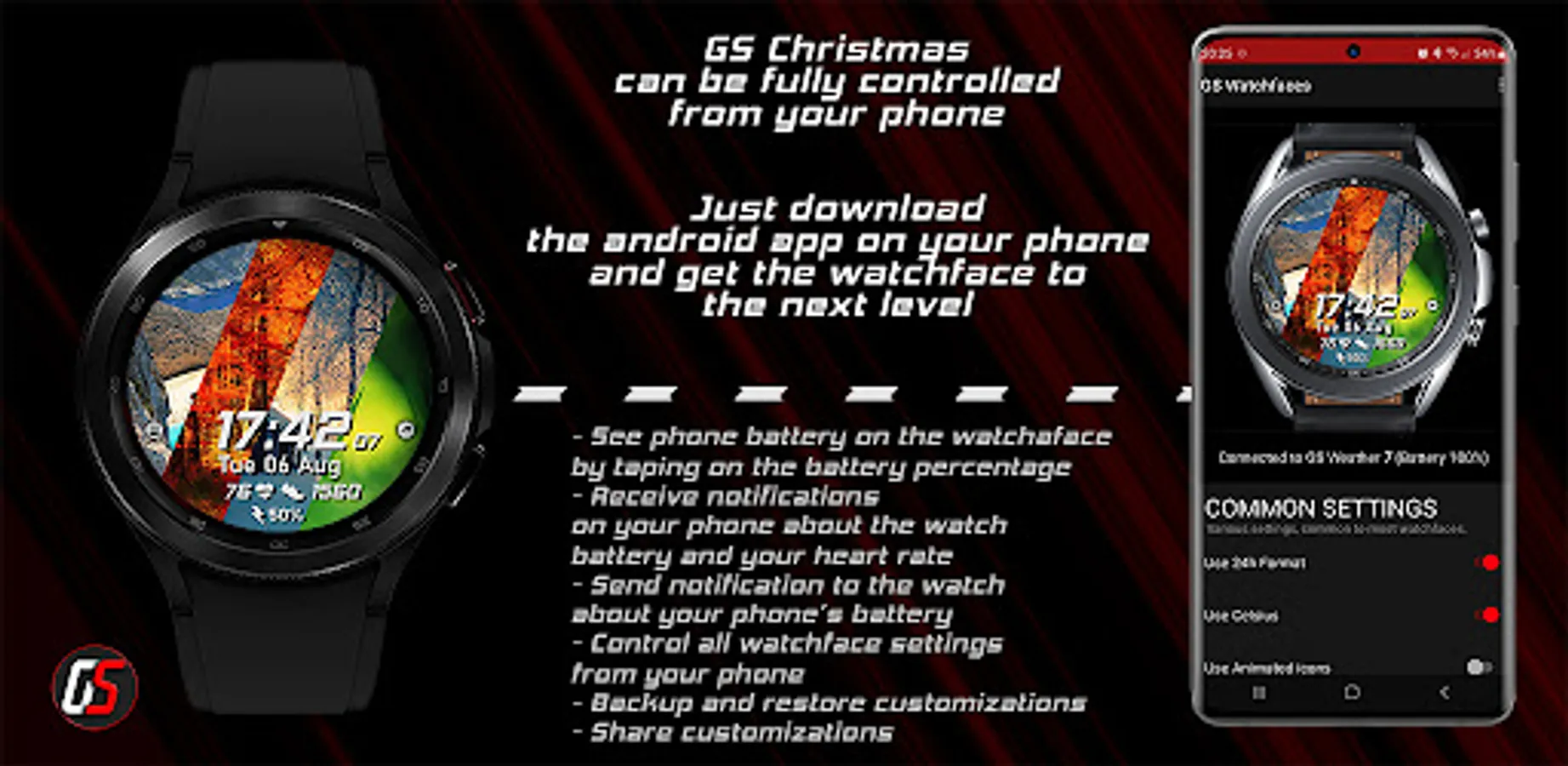 The watchface can be controlled from your phone (a separate application needs to be installed on your phone). This gives you the ability to control all watchface settings, backup and restore customizations, receive notifications from the watchface when the battery drops to the level you have set, or your heart rate bpm reaches the limit you have set.
