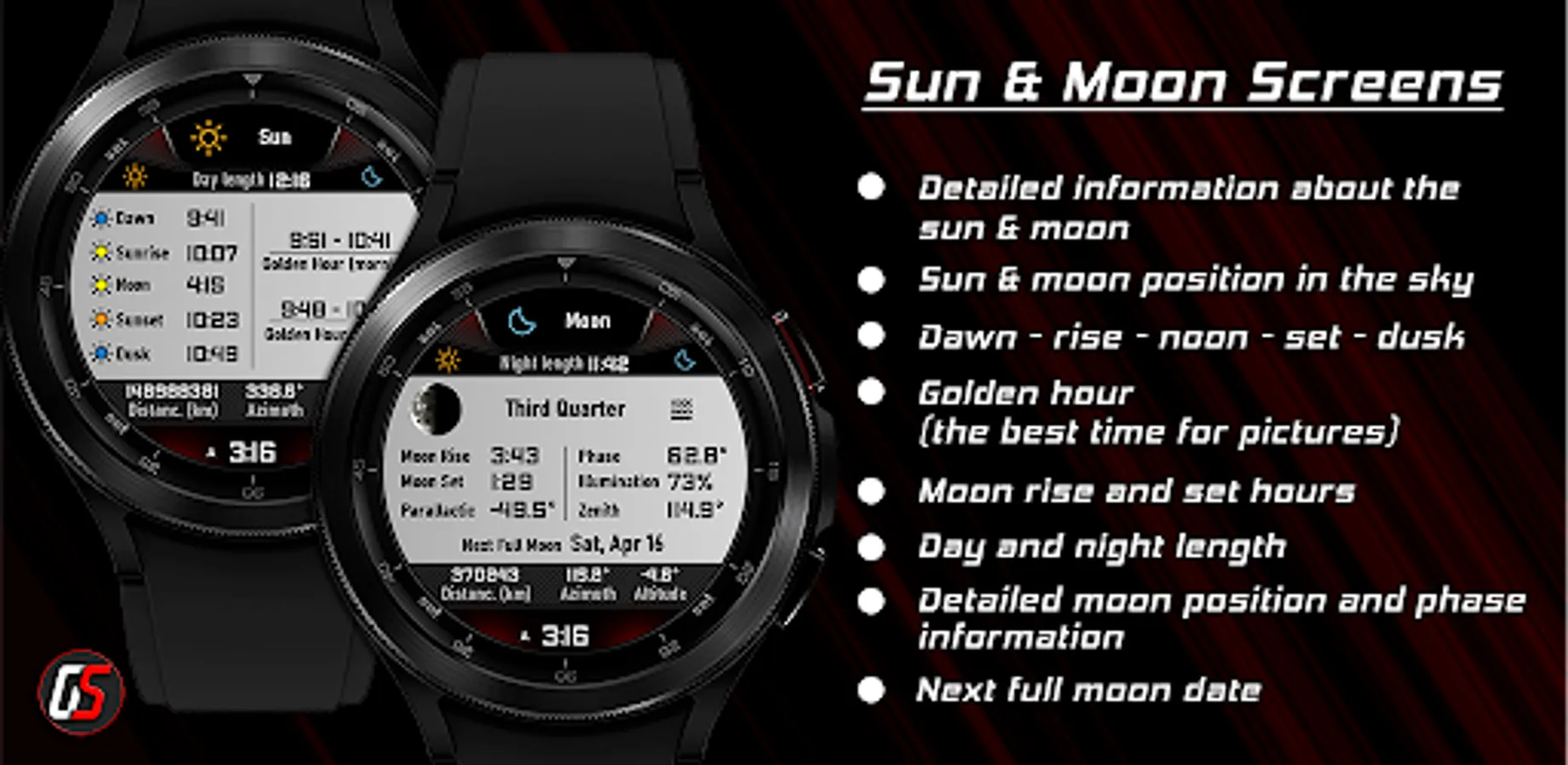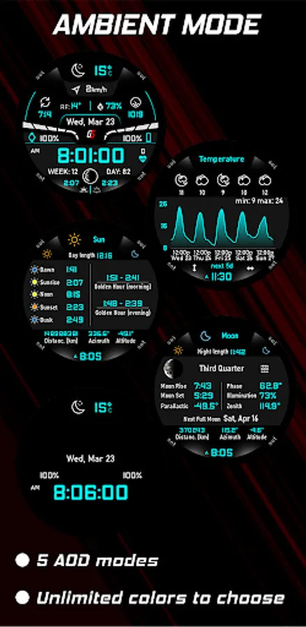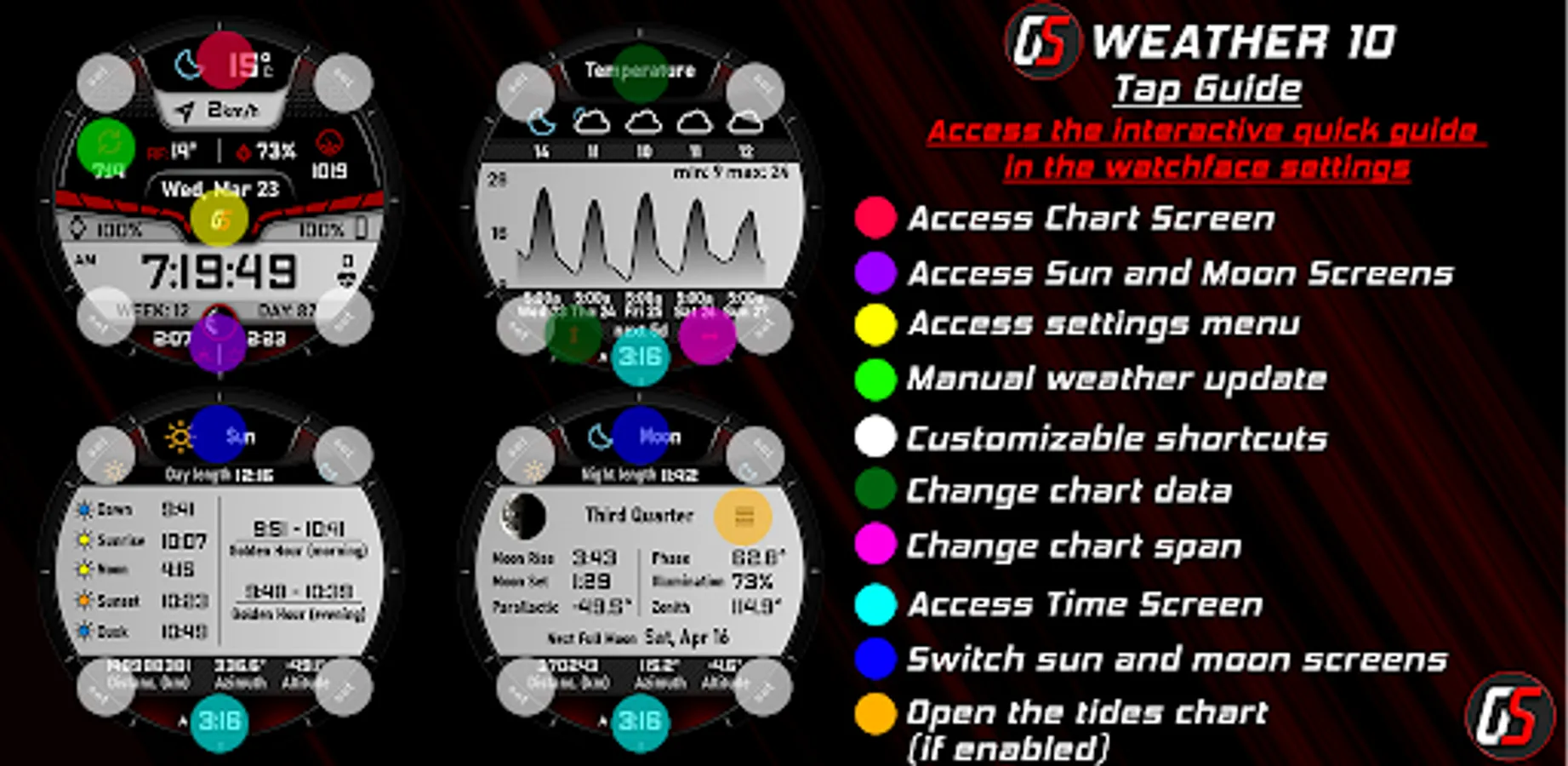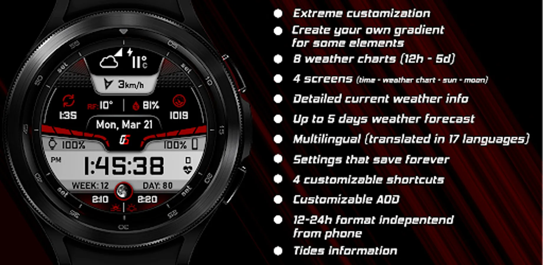 GS Weather 10 is an advanced weather watchface for Wear OS smartwatches with unique features and extreme customization, fully translated into 17 languages.