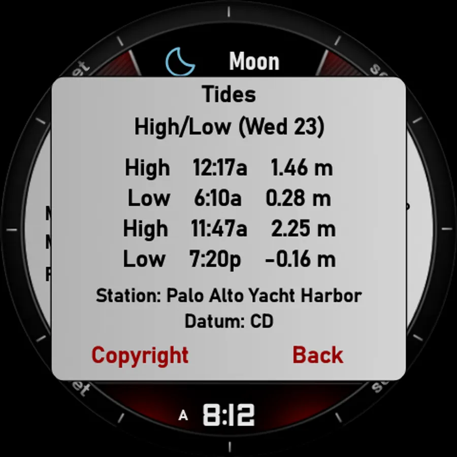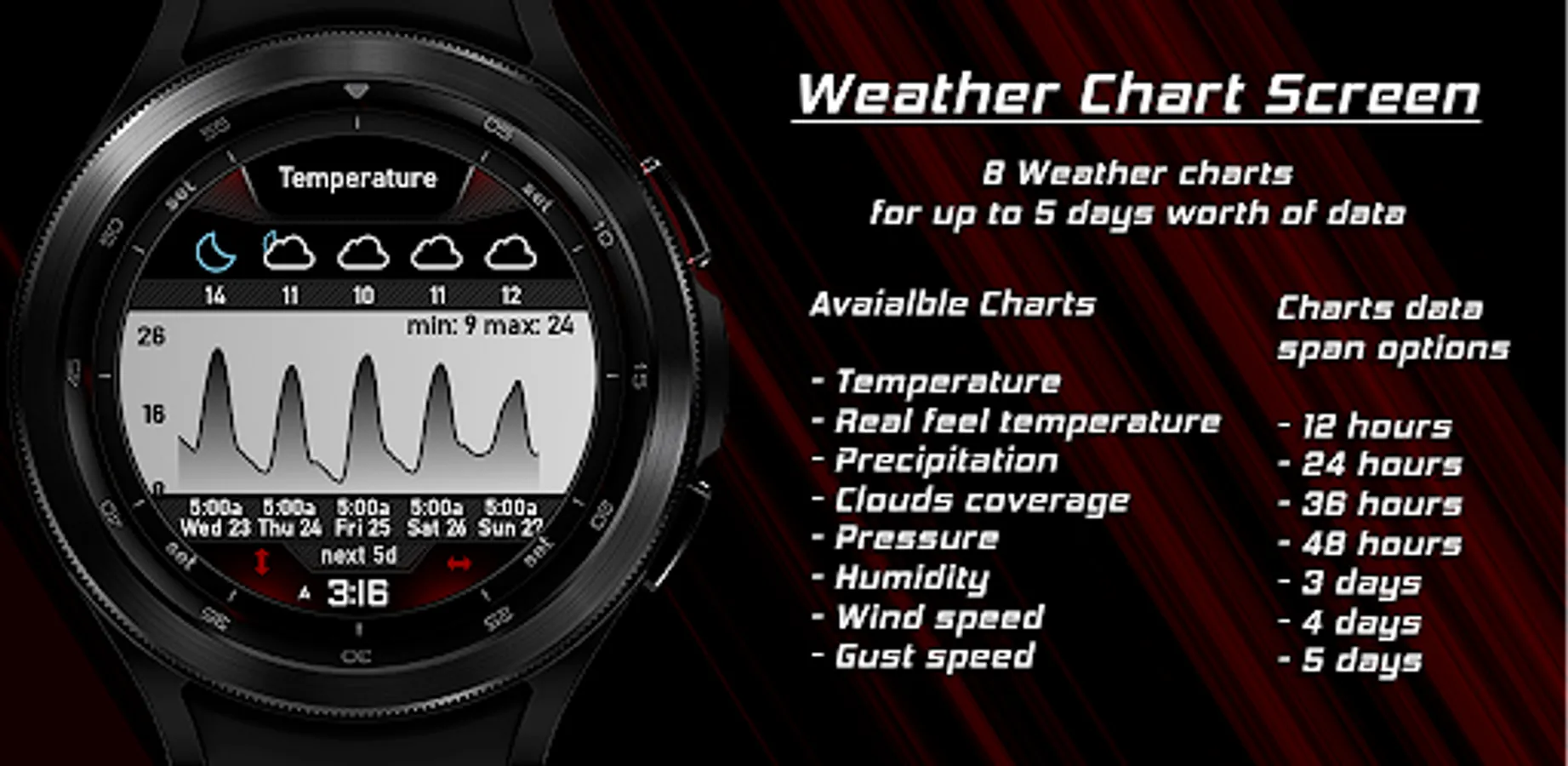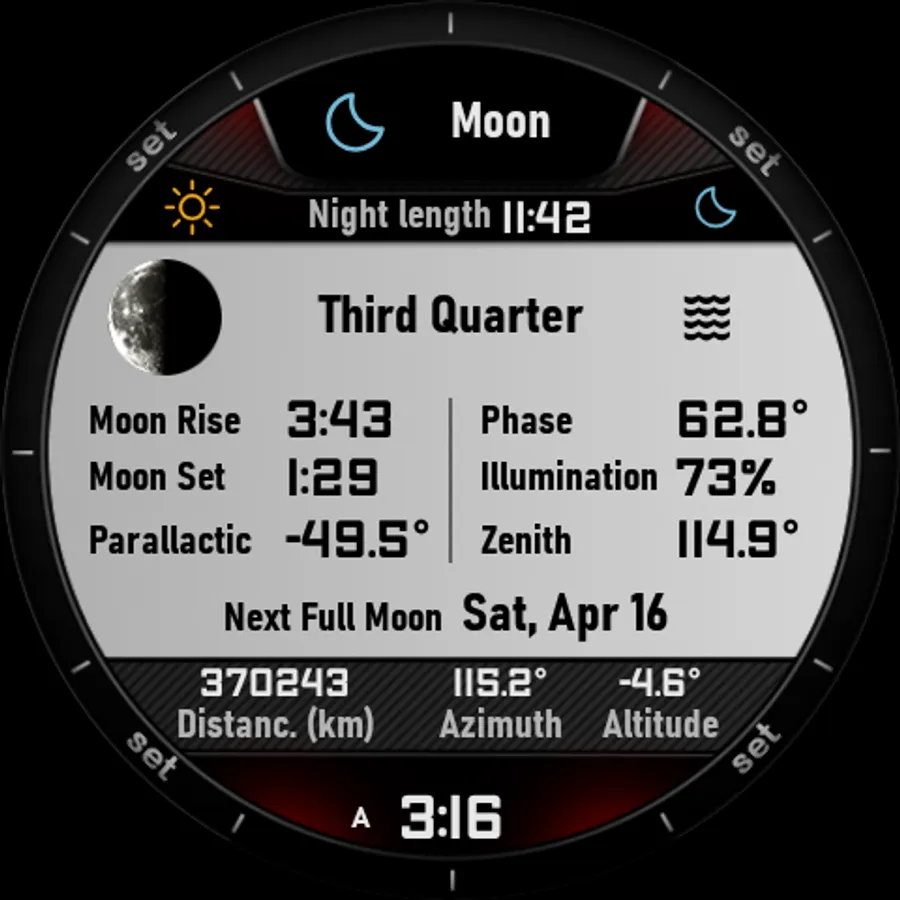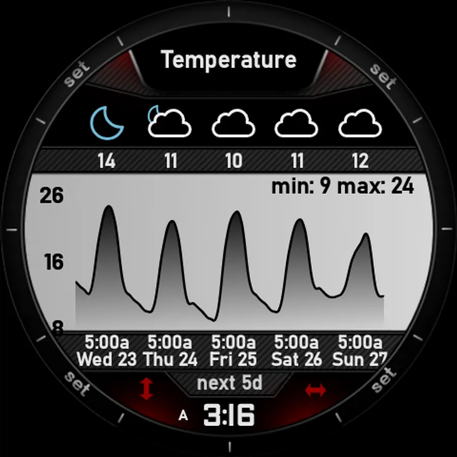 The watchface has 4 main screens on which it shows all the information. The time, weather (chart), sun, and moon screen.