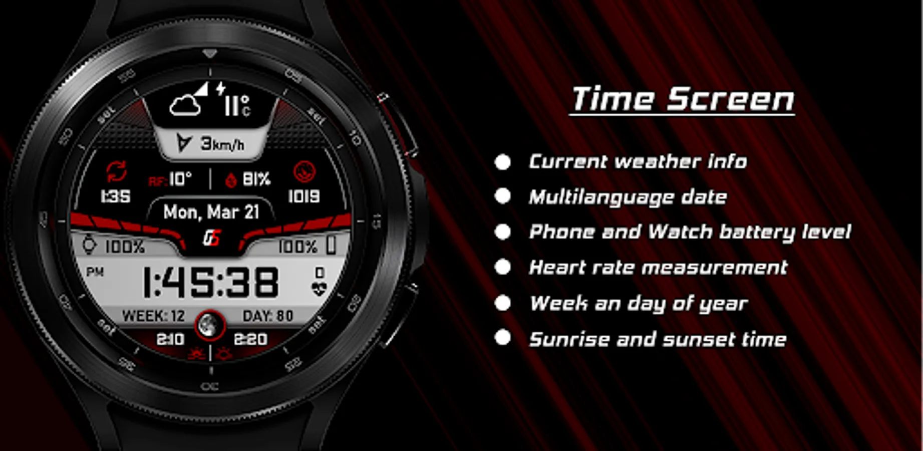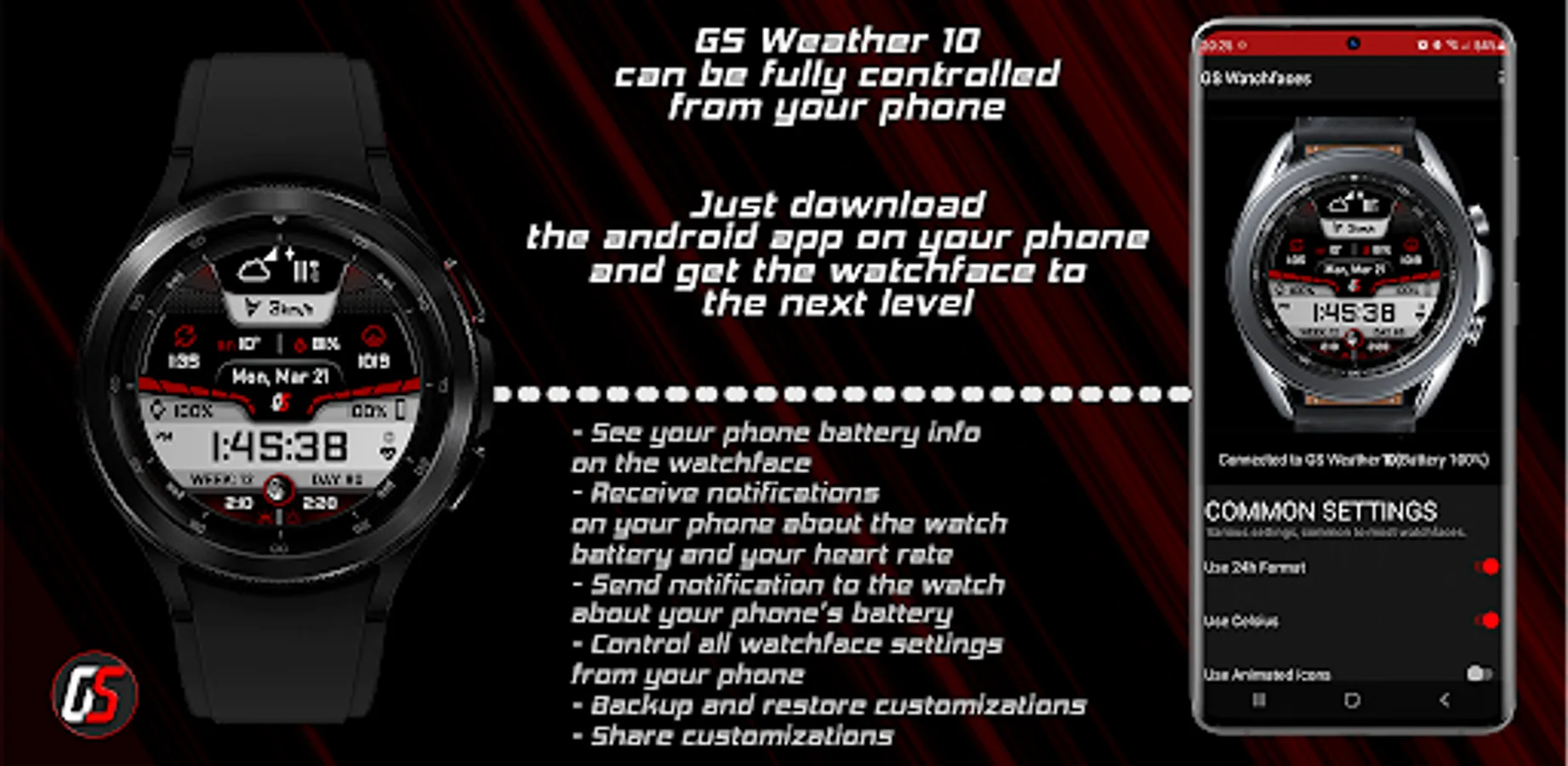 The watchface can be optionally controlled from your phone (a separate application needs to be installed on your phone). This gives you the ability to control all watchface settings, backup and restore customizations, and receive notifications from the watchface when the battery drops to the level you have set, or your heart rate bpm reaches the limit you have set.