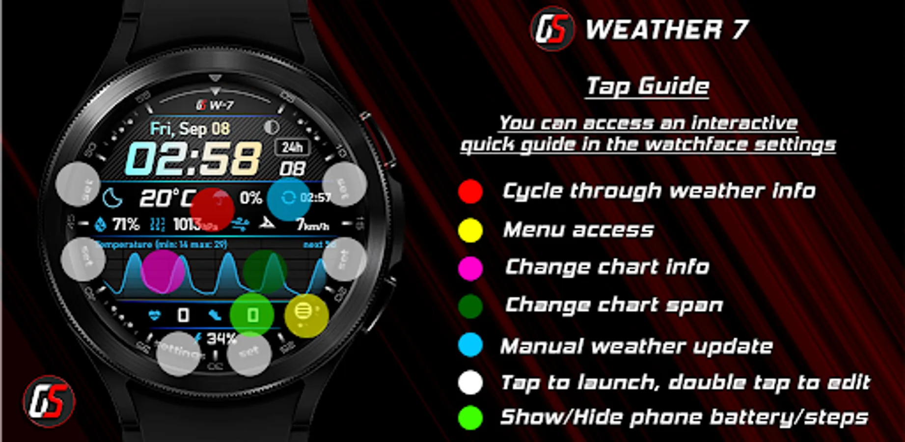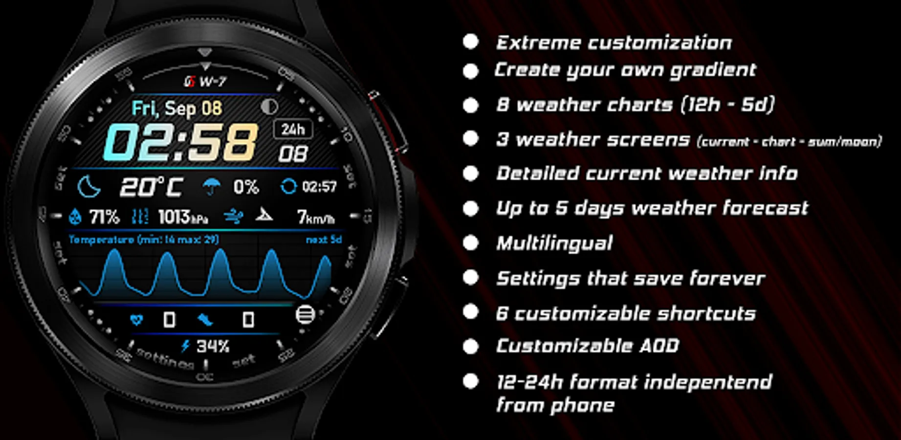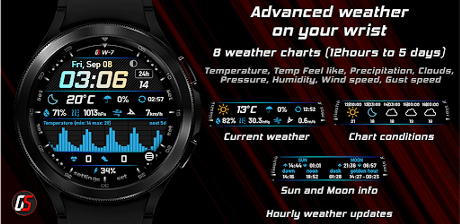 GS Weather 7 is an advanced weather watchface for Wear OS smartwatches with unique features and extreme customization, fully translated into 11 languages.