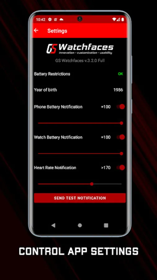 - Receive notifications from the watchface about the watch battery and your heart rate. You can set when and if you want to receive them.