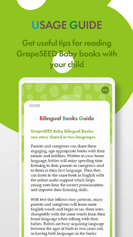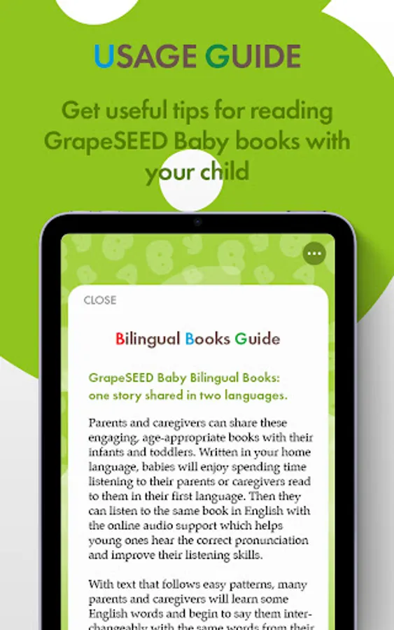 With the GrapeSEED Baby app, parents and caregivers have convenient access to English audio narration for the GrapeSEED Baby series of bilingual books.