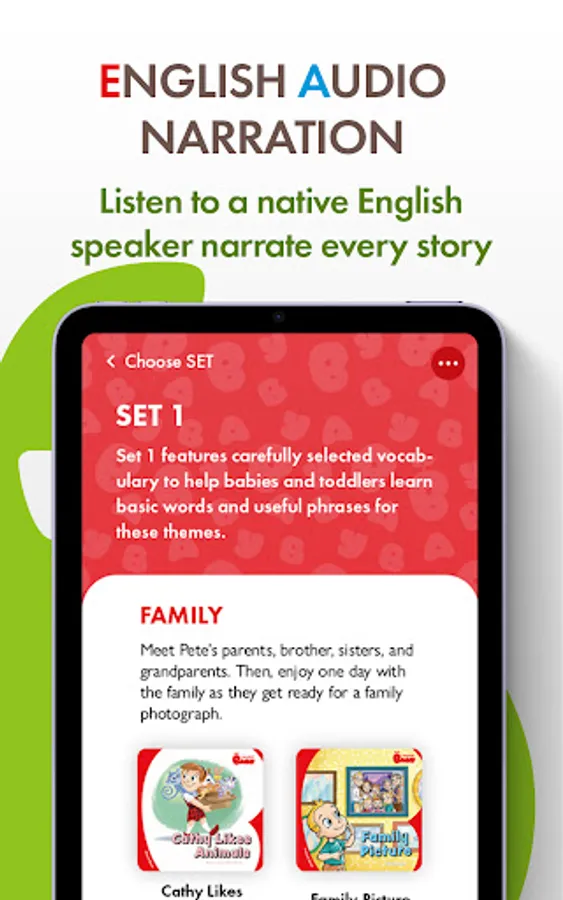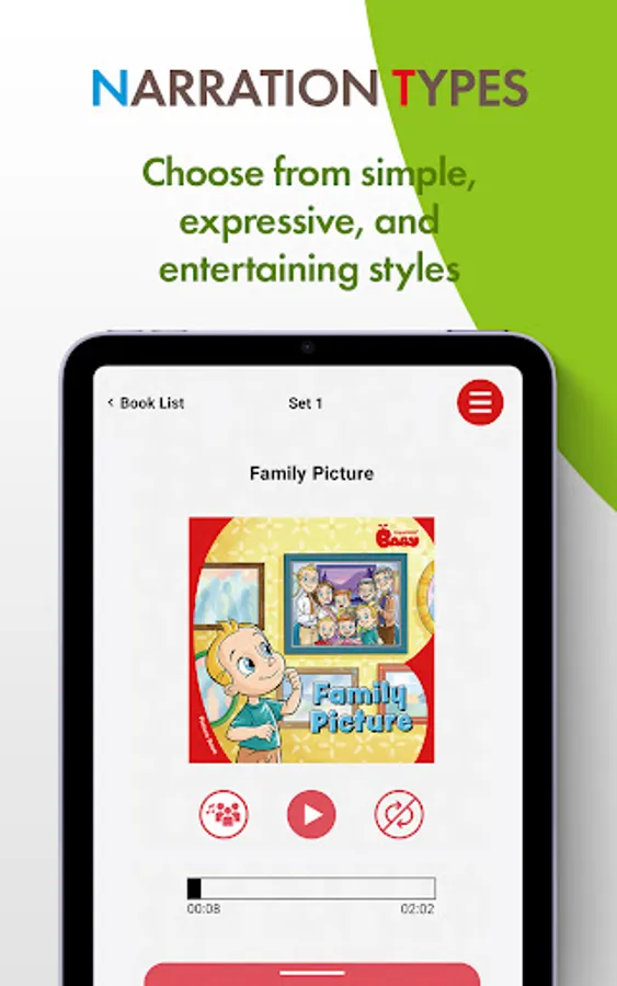 Each GrapeSEED Baby book comes with 2-3 narration options: simple, expressive, and entertaining. Use the app to play the English narration and give your child a head start at learning English.