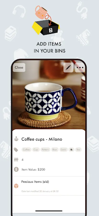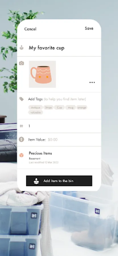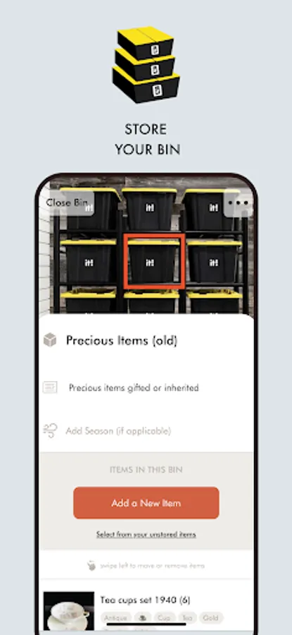 • ADD ITEMS: When you are ready to store your items, add each item to the bin by simply taking a photo or adding a description