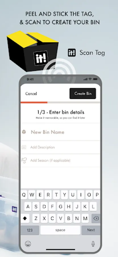 • CREATE BINS: Simply stick the intelligent tags on each of your bins and scan the tag with the app to add a bin description