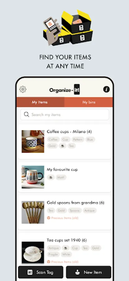 • FIND YOUR ITEMS: Later, you can use the the in-app search to quickly find where your items are stored.