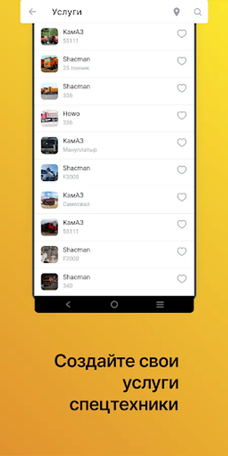 The mobile application for special equipment is a universal platform that allows users to rent, sell, repair special equipment, search for a driver to work with equipment, buy spare parts and place orders for special equipment, as well as carry out logistics between cities.