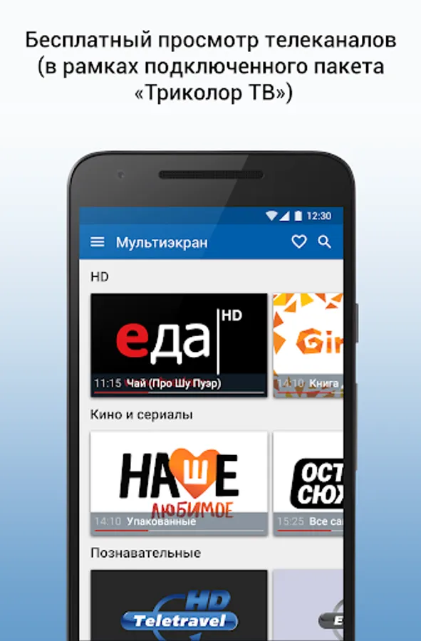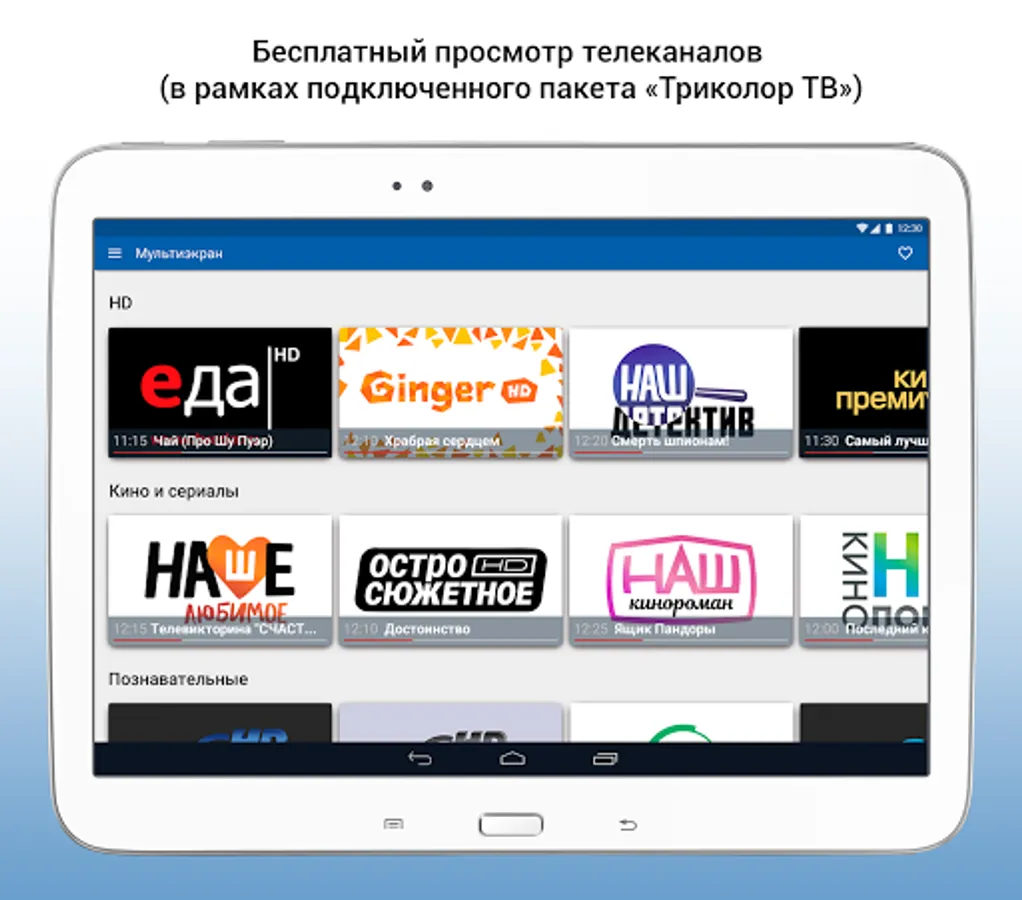 View TV channels available to subscribers "Tricolor TV" with an active subscription to the basic package of channels "One". Check whether your receiving equipment service, "Multi-screen" and to clarify the conditions of its use can be on tricolor.tv (12+).