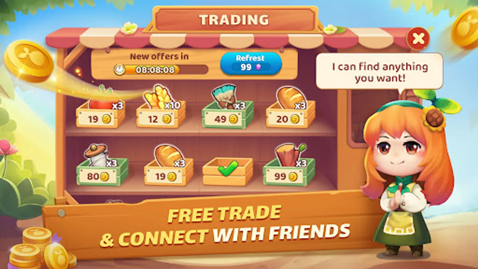 Merchant Guild is the busiest place in town, where you can trade all products made by your citizens. Let's show your business acumen by calculating the selling and buying prices that will benefit the town most. Other in-game features like helping friends, giving gifts to friends, etc will also make your gaming moment more excited than ever.