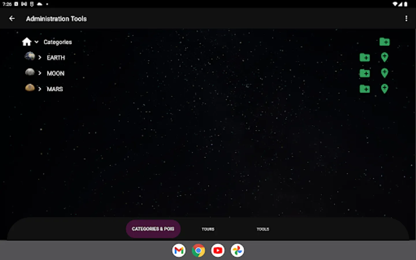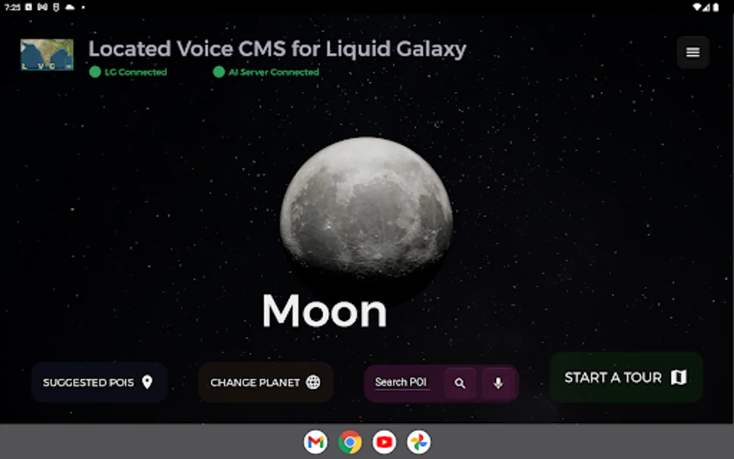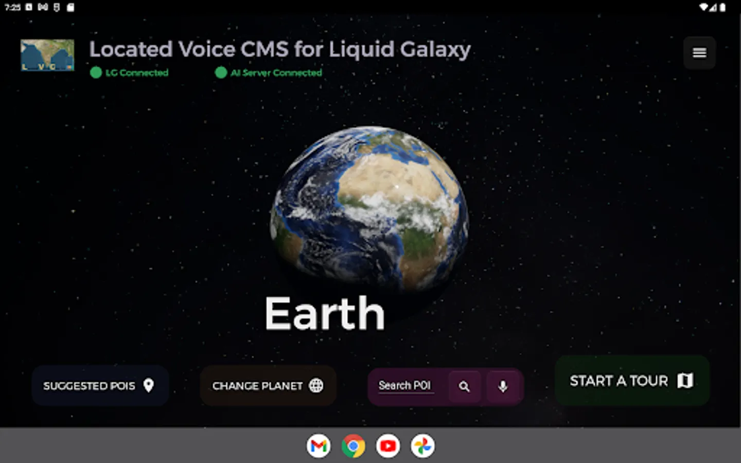 Located Voice CMS is an Android app that lets the user connect to a Liquid Galaxy system and send POIs and Tours. At the same time, the app also lets to create, update and delete POIs, Tours, and Categories. Use various tools to control your Liquid Galaxy System.
