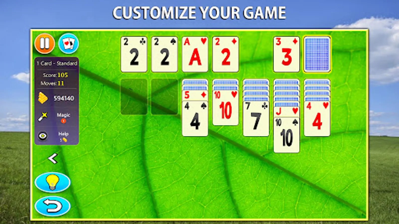 Solitaire Mobile is a modern card game specifically tailored for mobile devices. Customize your game as you want. It comes with 17 card fronts, 26 card backs and 40 backgrounds to pick from. It has multiple settings you can turn off and on.