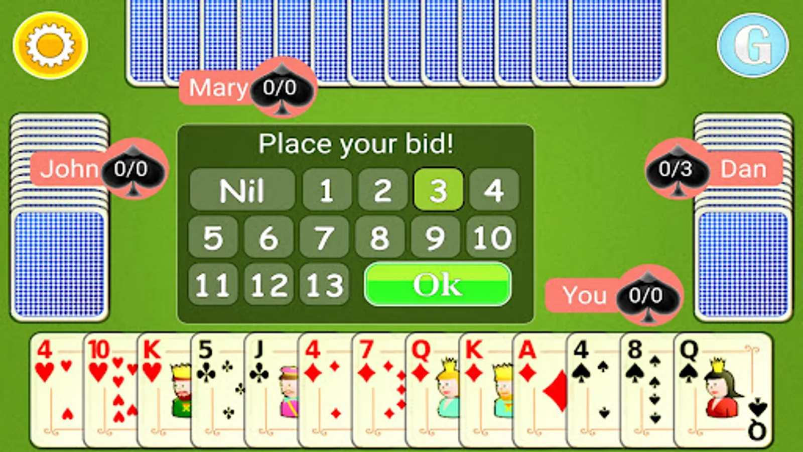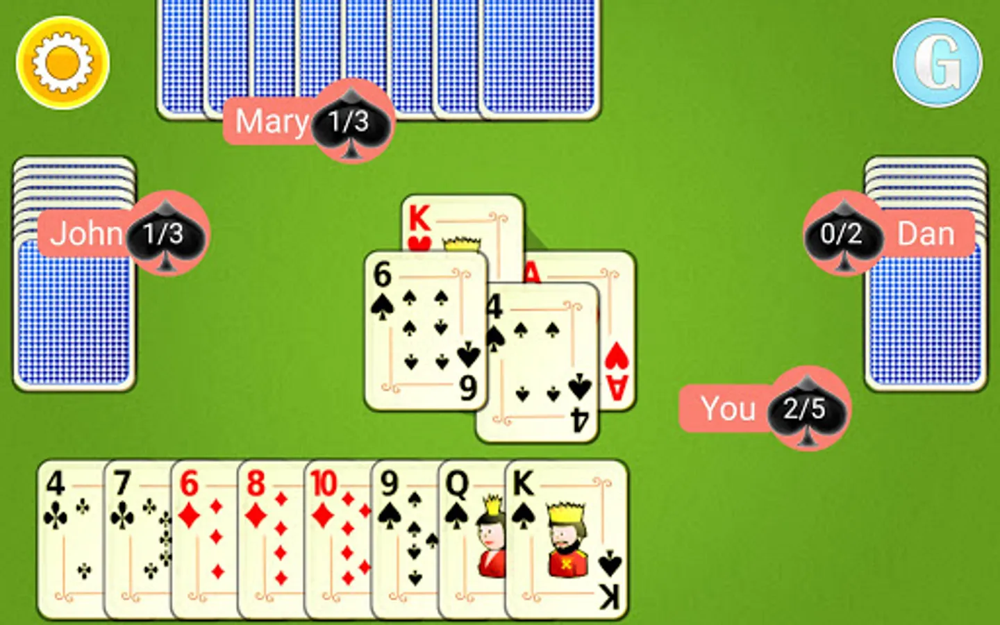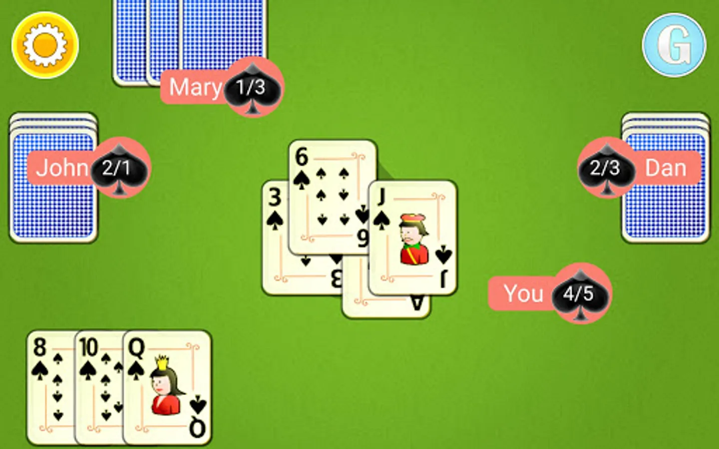 Spades Mobile is a very popular trick-taking card game. The goal of the game is to take at least the number of tricks that were bid before each hand. The game is played in teams and spades are the trump. Your partner sits in front of you and the deals are played clockwise. If you and your partner win as many tricks as the bid you made together, your team gains 10 points for each trick. If your team wins fewer tricks than the bid, you lose 10 points for each bid trick. In order to win you need to make as many points as possible.
