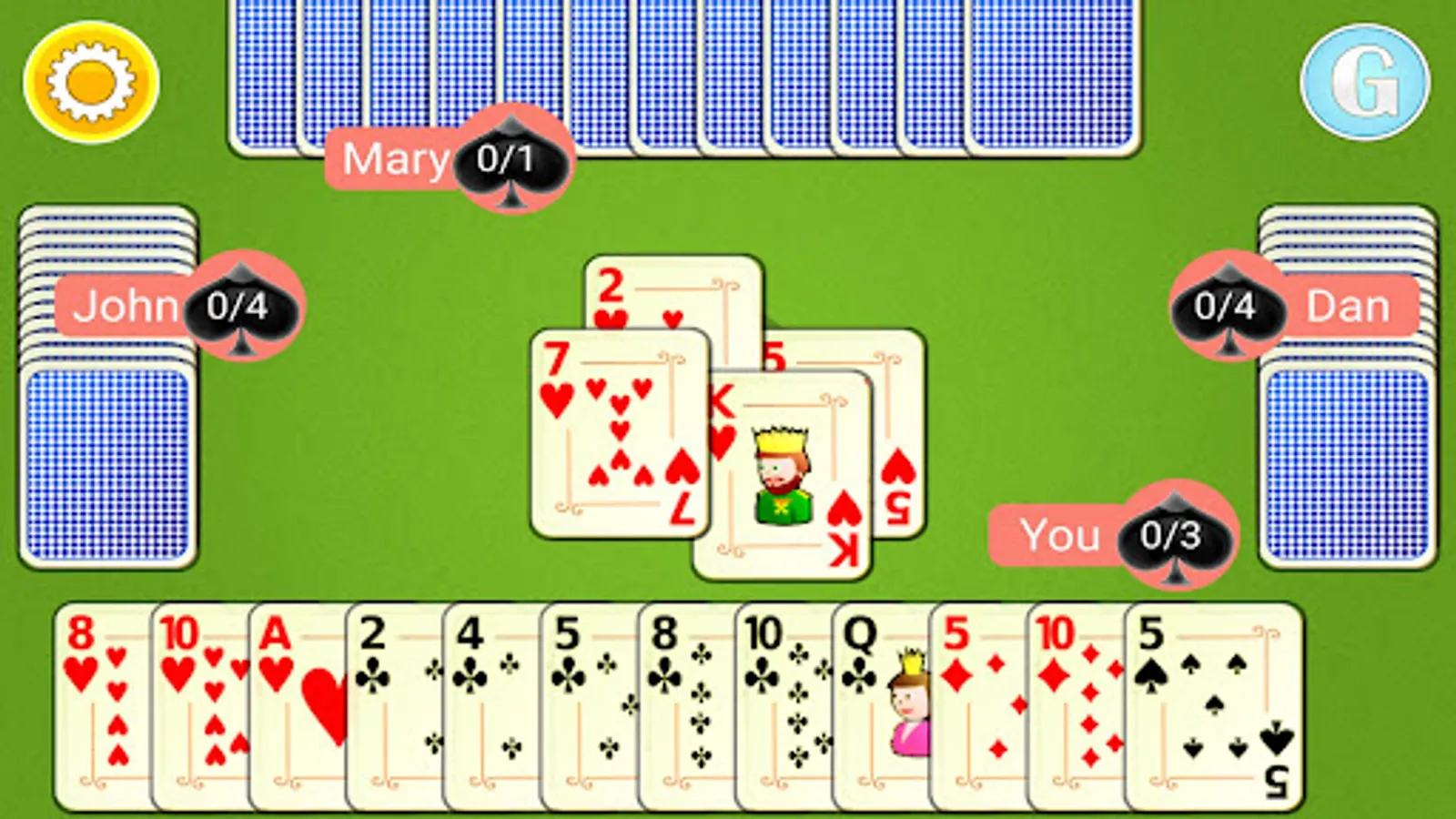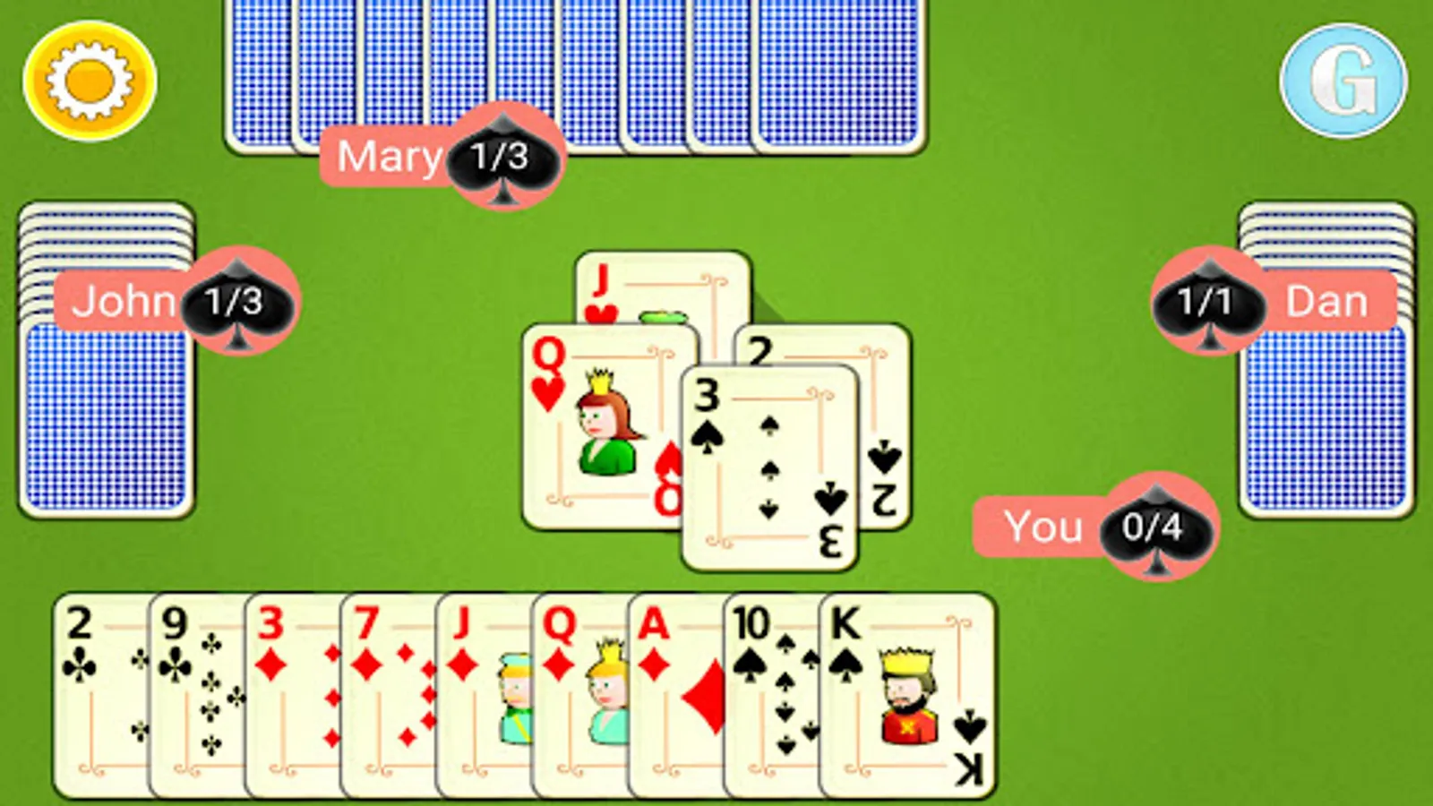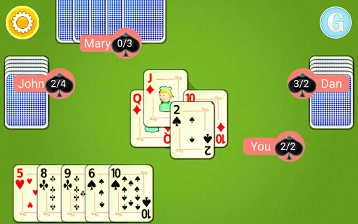 Spades Mobile is a very popular trick-taking card game. The goal of the game is to take at least the number of tricks that were bid before each hand. The game is played in teams and spades are the trump. Your partner sits in front of you and the deals are played clockwise. If you and your partner win as many tricks as the bid you made together, your team gains 10 points for each trick. If your team wins fewer tricks than the bid, you lose 10 points for each bid trick. In order to win you need to make as many points as possible.