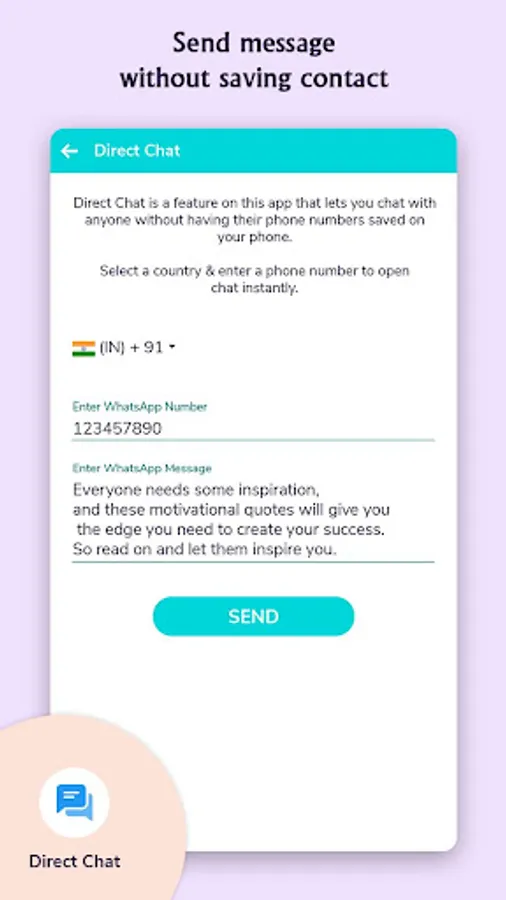 Use Direct Chat to send messages to anyone without saving their phone numbers in your device. Its great features in application that we didn't need to save number