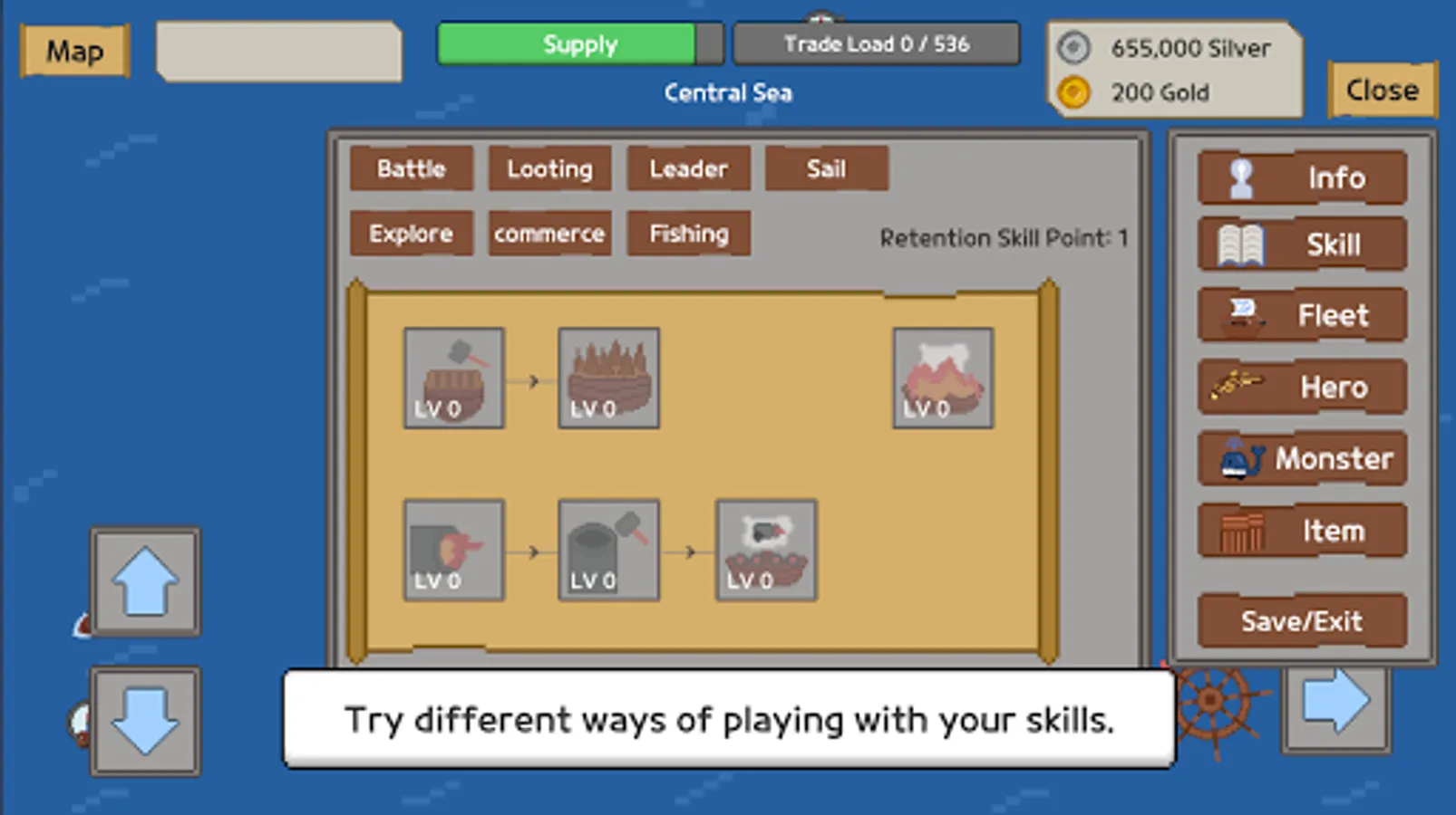 Skills are divided into combat, looting, leadership, navigation, exploration, commerce, and fishing categories.