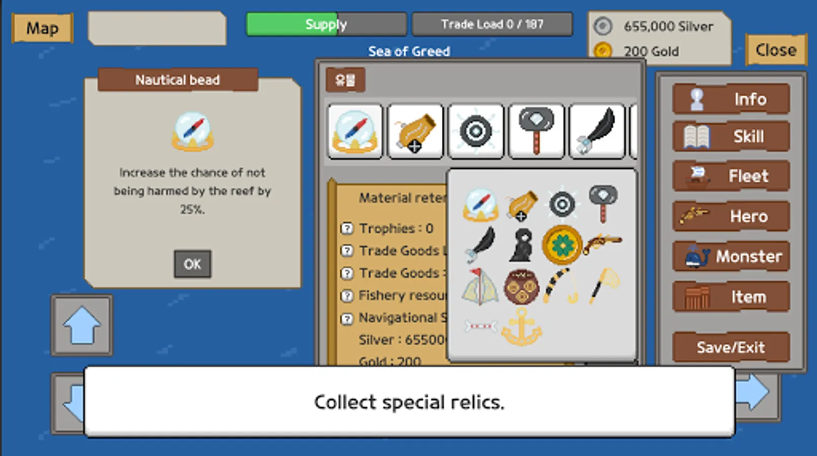 Clearing is possible only by gathering ships, monsters, heroes, relics, etc. and building a strong fleet.