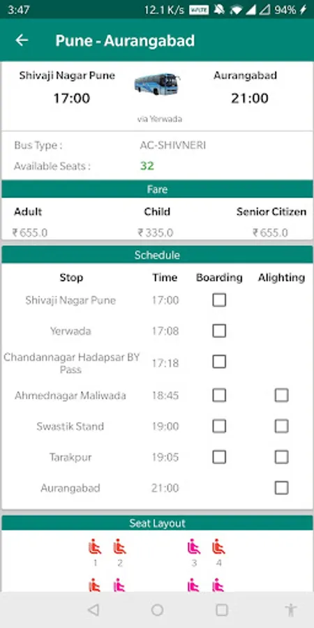 The app also allows you to reserve bus tickets for routes covered by MSRTC, in and around Maharashtra. Choose from various service type (A/C and non-A/C) like Shivshahi, AC Shivneri, AC Ashwamedh, Ordinary Express, Semi-Luxury, Night Express, AC Sheetal, Semi Sleeper Volvo, Shivshahi Sleeper.