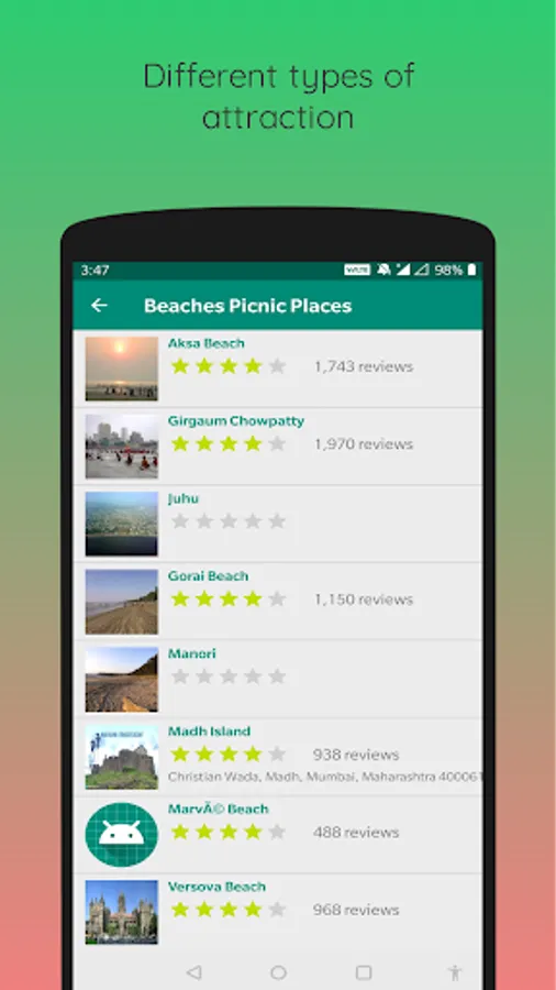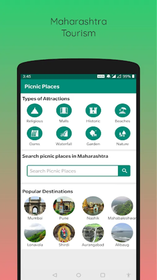 Maharashtra State 1st app which provide 2500+ places like Forts, Waterfalls, Beaches, Dams, Religious etc information from all over the Maharashtra State to the Tourist and also Easily find out the places info via popular cities like Mumbai, Pune, Nashik etc.