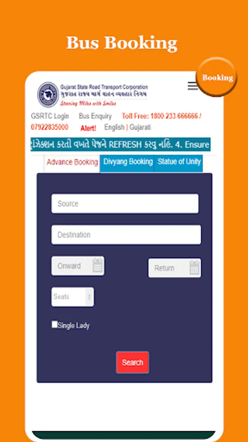 This is not official app of GSRTC or not associated with Gujarat State Road Transport Corporation in any ways.The information contained in this app is for general information purposes only.We are not responsible for any booking made through this app.