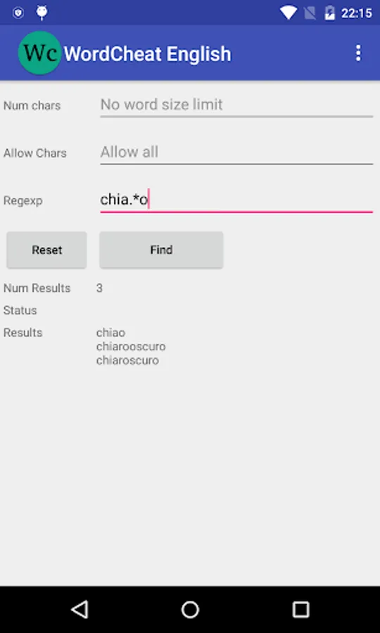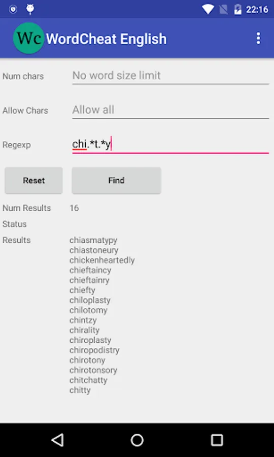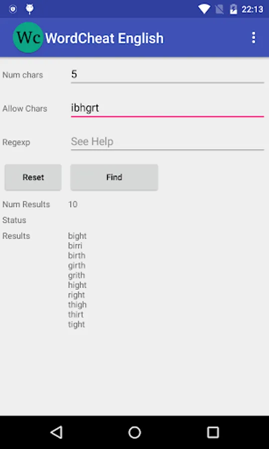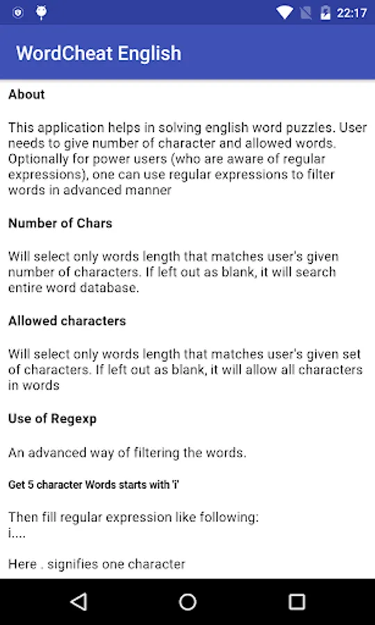 This application helps users to solve various word games/puzzles. It supports word search with conditions like 'size of word', 'allowed characters' and 'regular expressions'