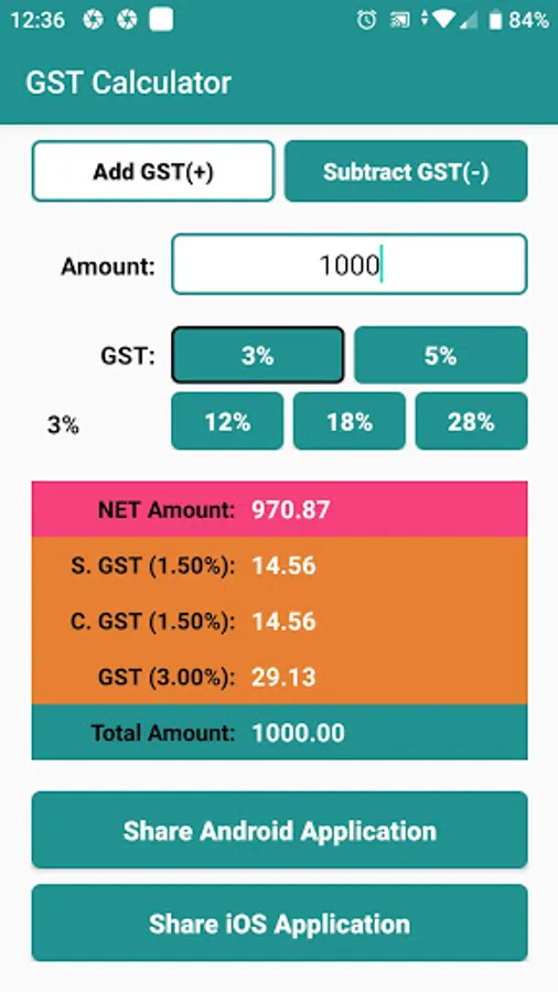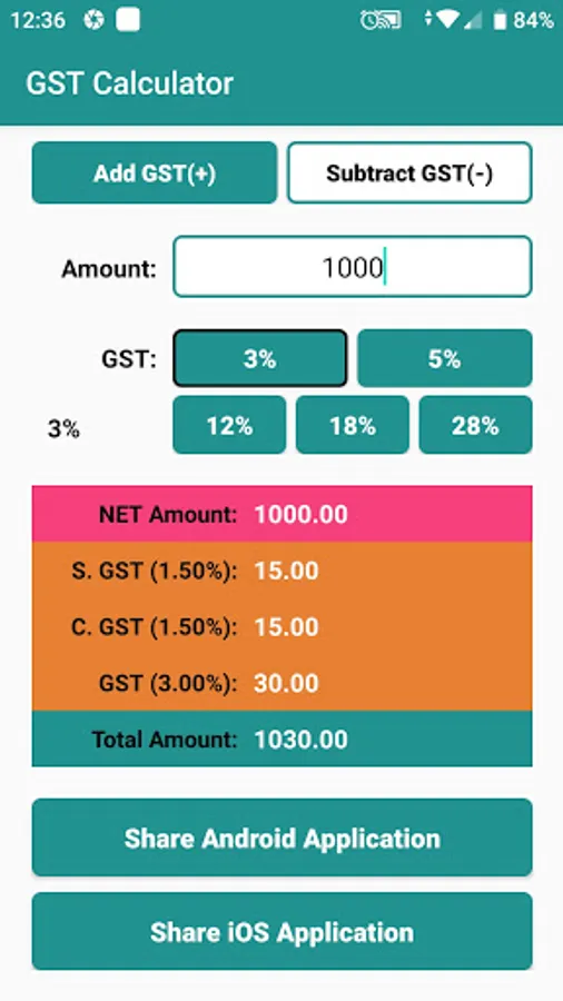 We have a predefined set of GST Rates which are 3%, 5%, 12%, 18%, and 28% so that you can quickly carry out the calculation. You can customize the Rates as per your need in settings. You can also share or copy your calculations with handy buttons.