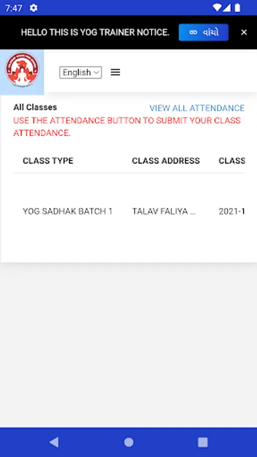 Gujarat State Yog Board android app for taking classes and attendance online using smart phone.