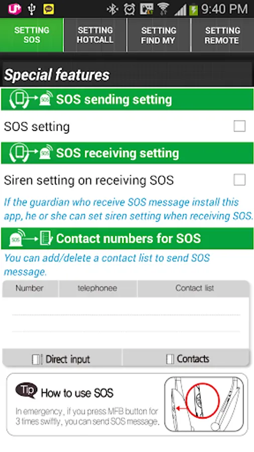 - Hot Call ( Call to the registered number ) : Register the frequent call number ( 1 contact number). Then, if you press volume up button for 2 times shortly, it connects to the number swiftly.