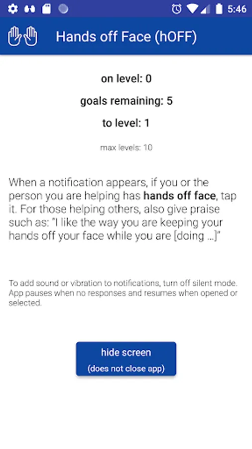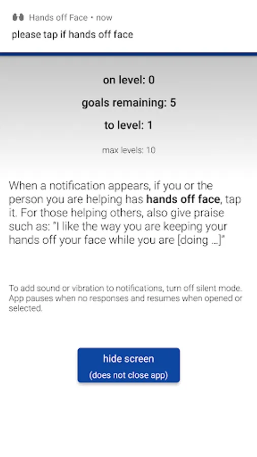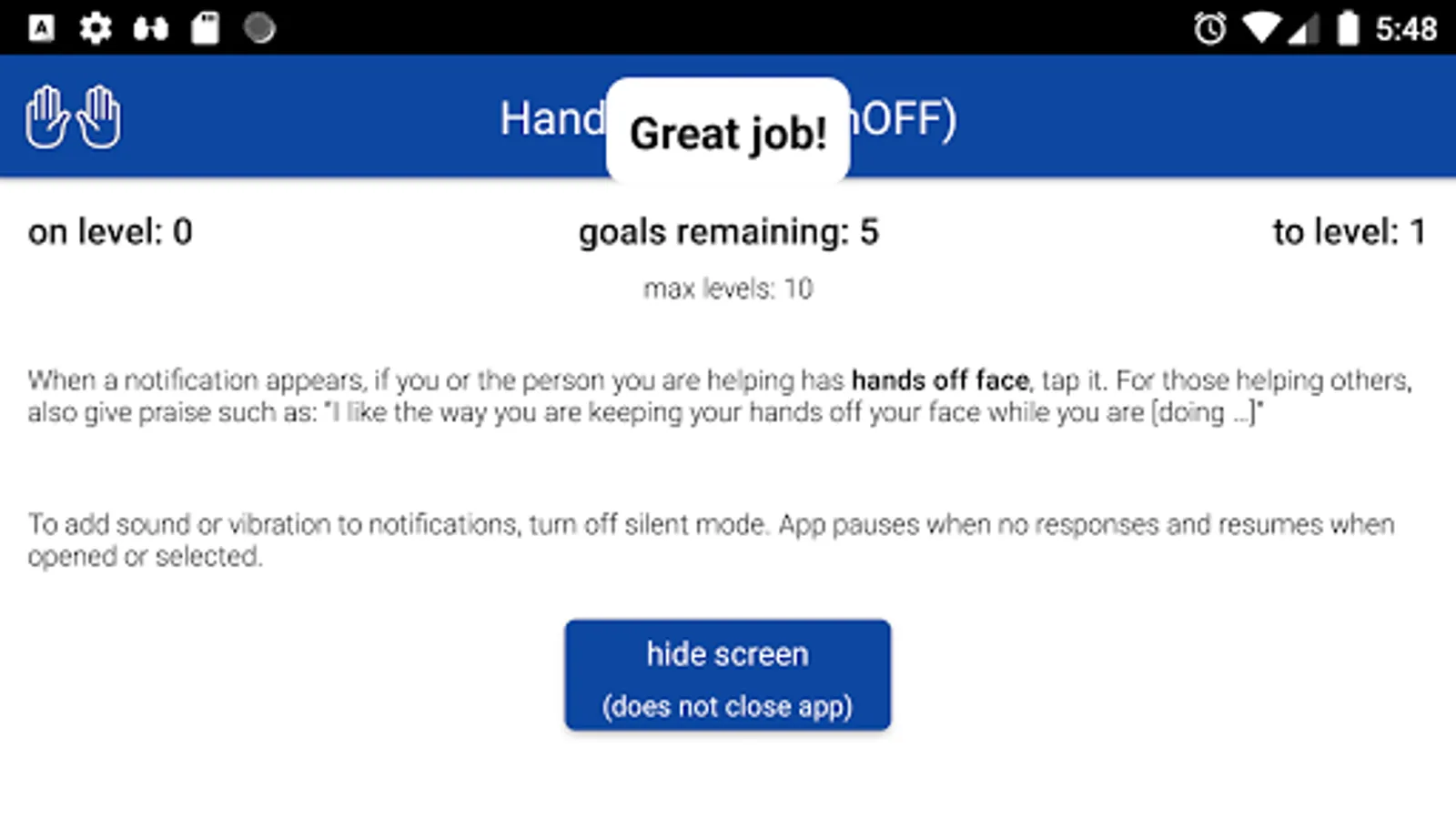 Touching one’s face can spread infections, and we are unaware that we do it so often. In a fun way, Hands Off Face helps you learn, and remember over time, to keep your hands off your face. The app can be used by individuals of all ages who are capable of using an app and by those who use it to help someone else. For examples, parents can help their children, and caregivers can even help those with special needs. The app automatically personalizes the learning process for you or the person you are assisting. Since the app automatically notifies you when interaction is needed, you may continue with your normal activities.