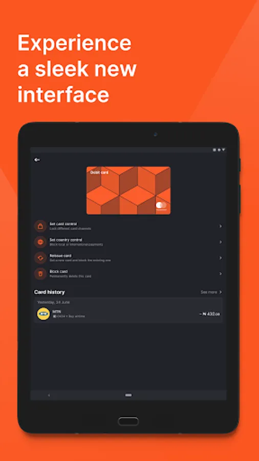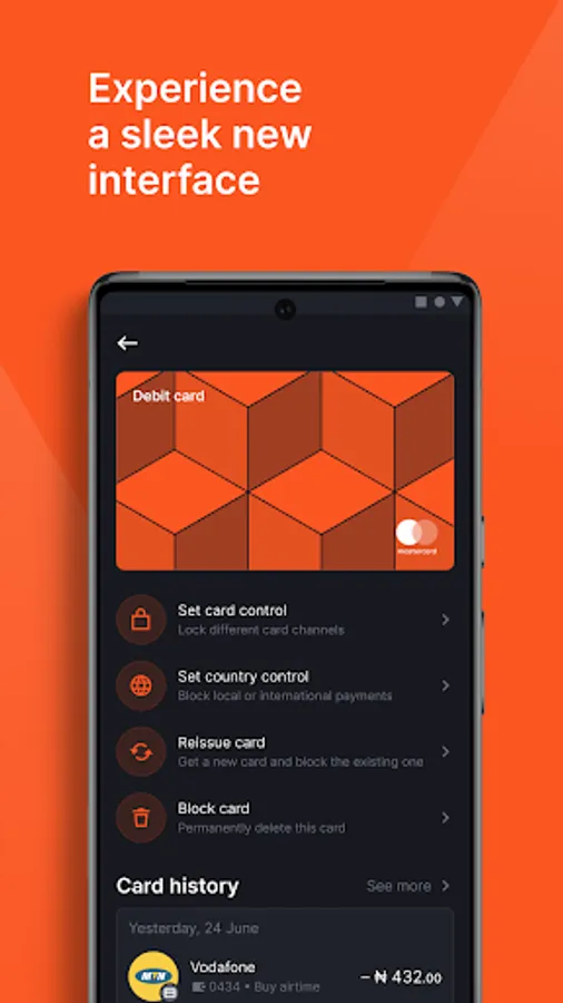 - Card control which allows you block your card payments by channel or by country