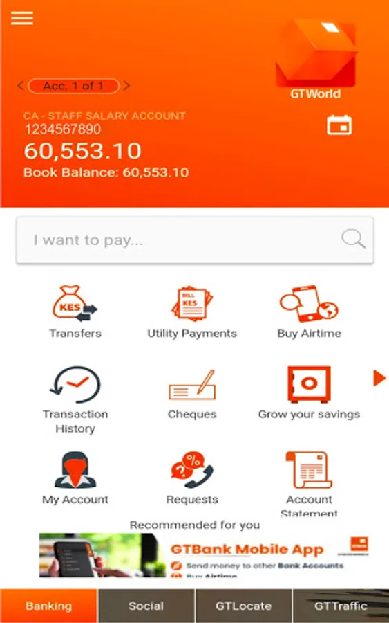 Welcome to a world of Seamless Banking! GTWorld is a Mobile App which enables customers make transfers (Own Account, Intrabank, Interbank, and Mobile Money transfers) and pay for services such as DSTV, GOTV, KPLC, NAIROBI WATER, Airtime Top Up, etc.