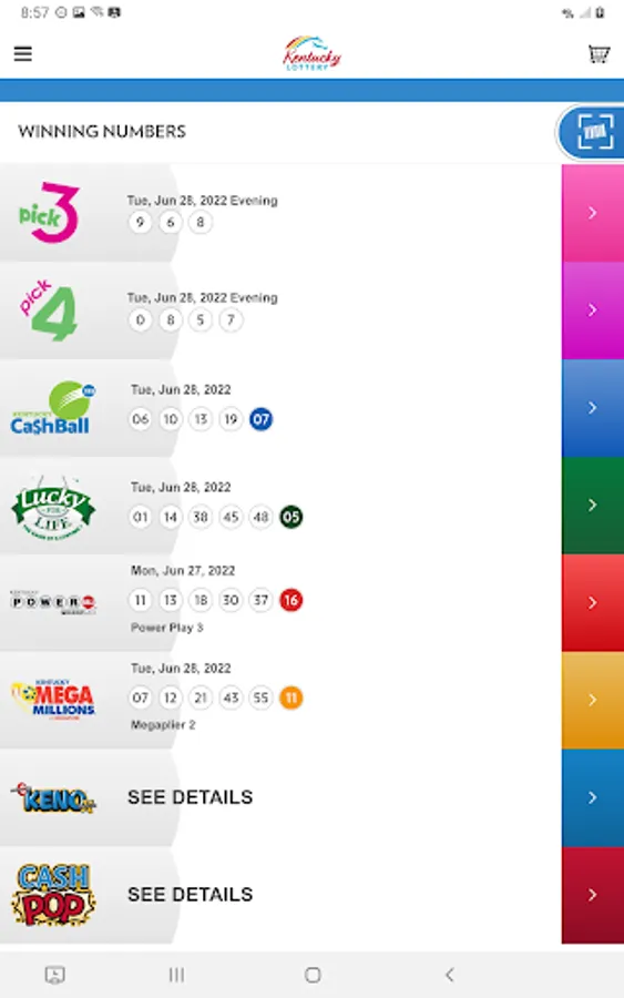 • Purchase Keno, Cash Pop, Pick 3, Pick 4, Powerball, Mega Millions, Lucky for Life, and Kentucky Cash Ball 225
